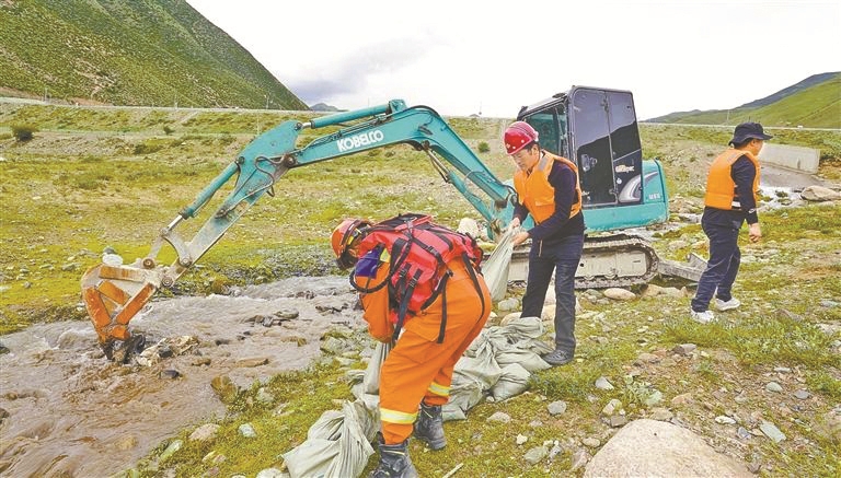 图为山洪灾害防御演练中,人员配合挖掘机进行河道抢险作业。西藏日报记者 格桑伦珠摄