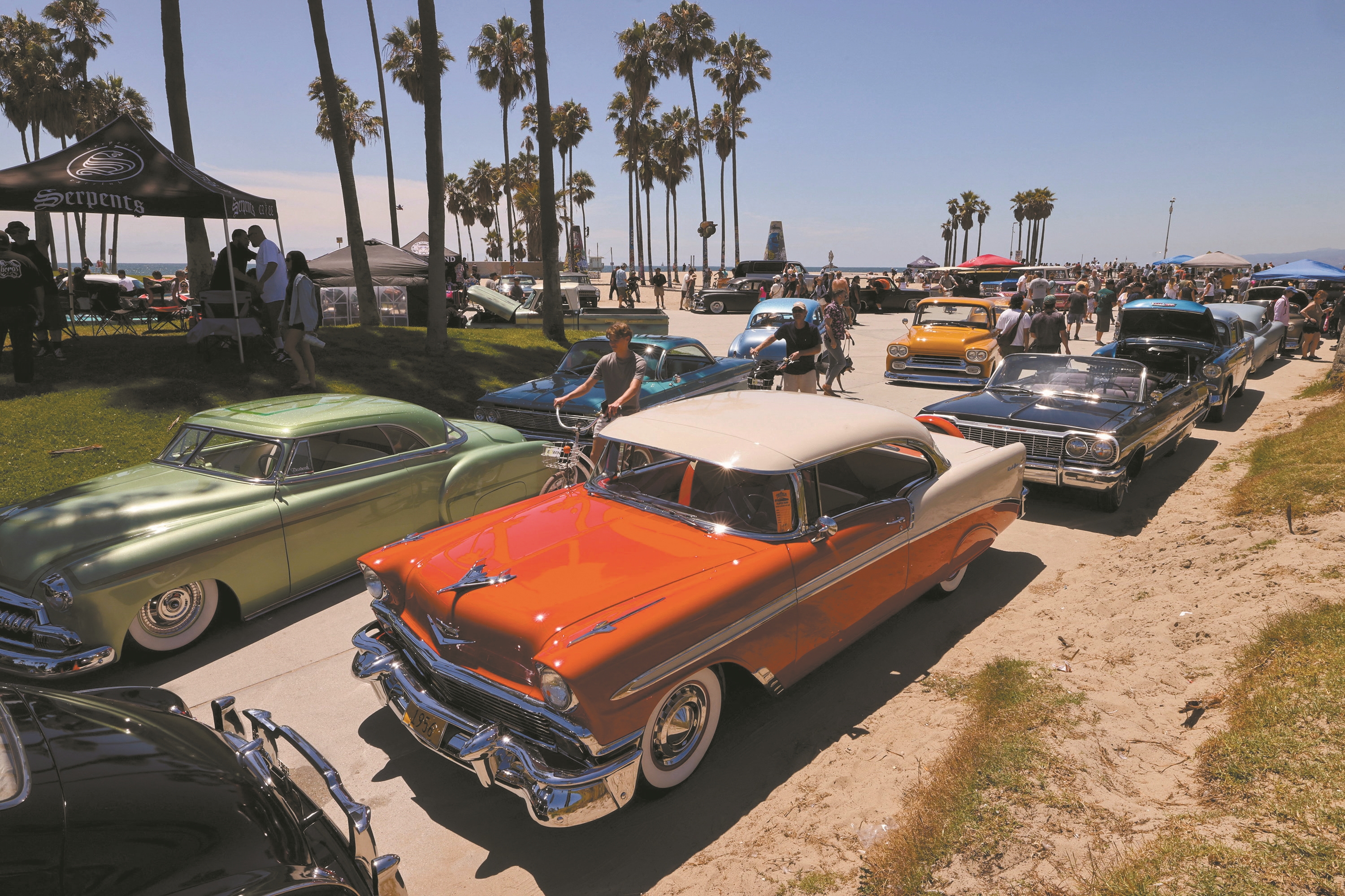 图①②为7月26日在美国加利福尼亚州威尼斯海滩拍摄的改装车。