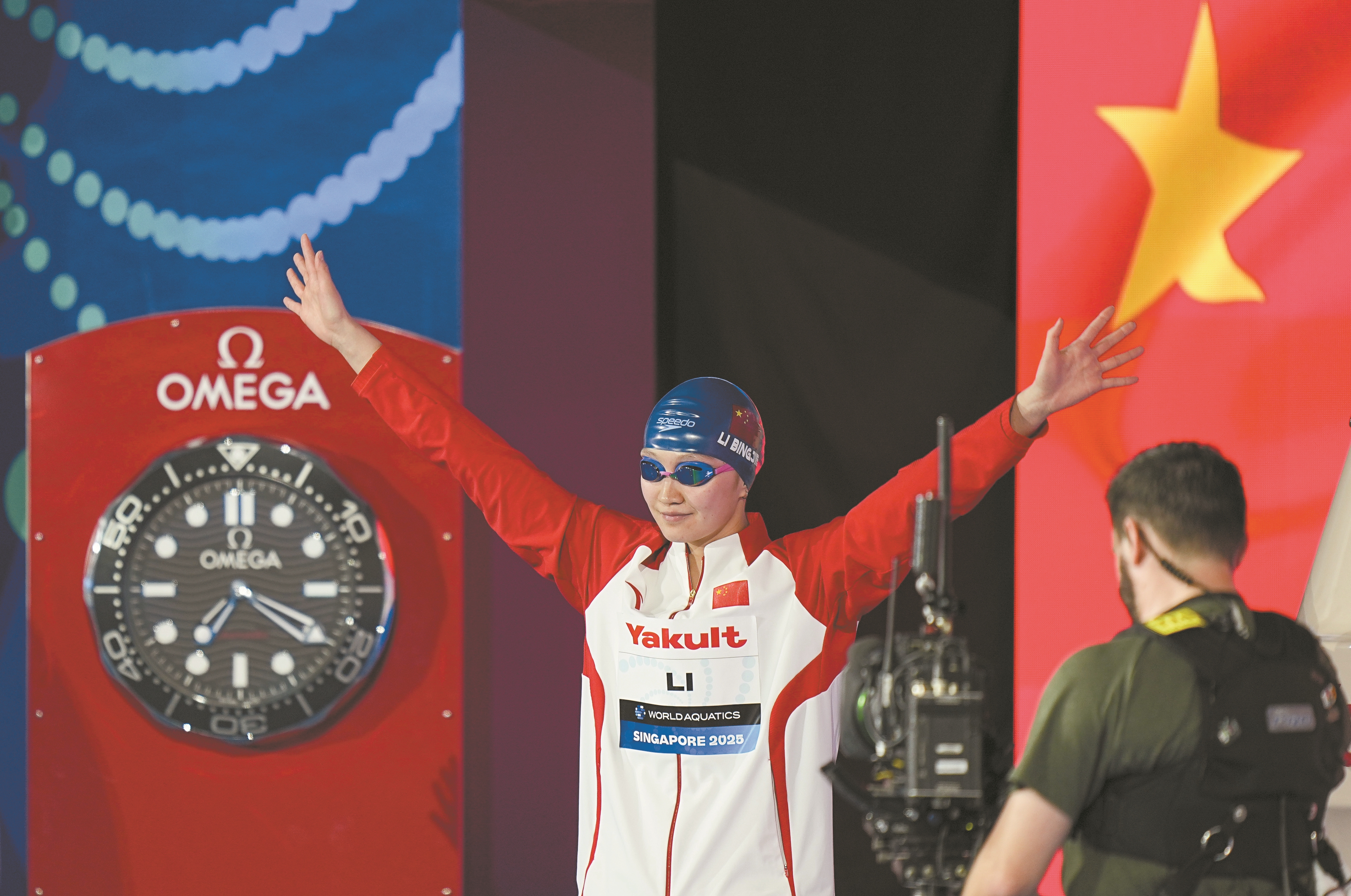 7月30日,2025年世界游泳锦标赛游泳女子200米自由泳决赛在新加坡举行。图为中国选手李冰洁在决赛前入场。最终,她获得亚军。