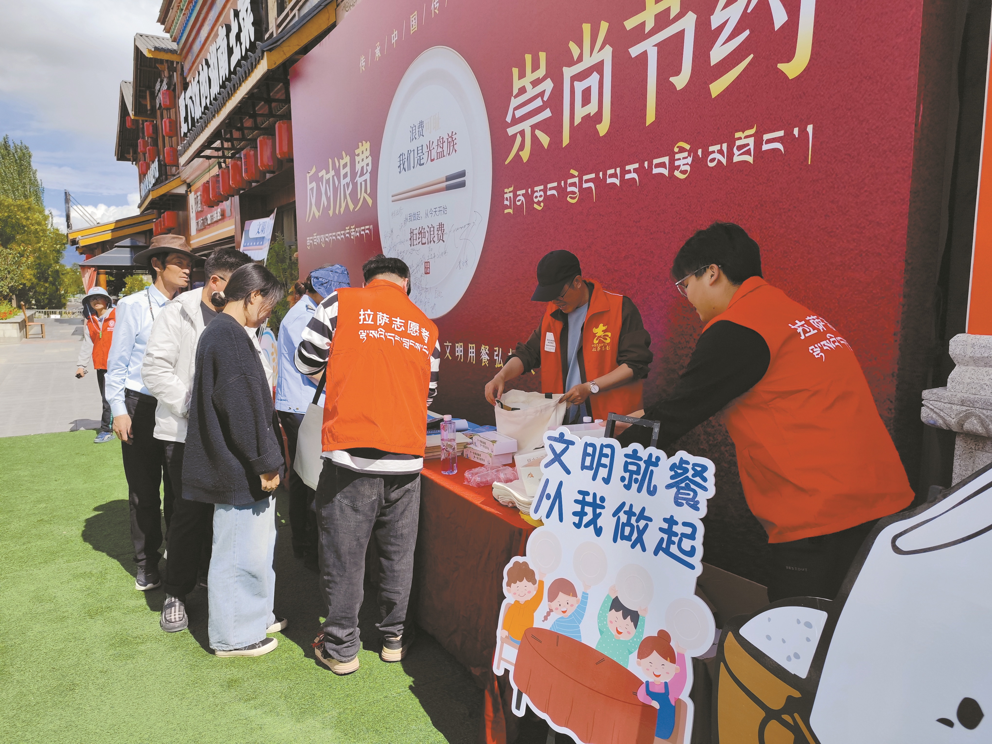 下午5时,仙足岛亿头牛牦牛火锅体验馆门前,工作人员与志愿者们化身文明使者,向过往市民发放《拉萨市文明行为促进条例》与《中华人民共和国食品安全法》宣传资料,将“反对浪费、崇尚节约”的新风送入人心。