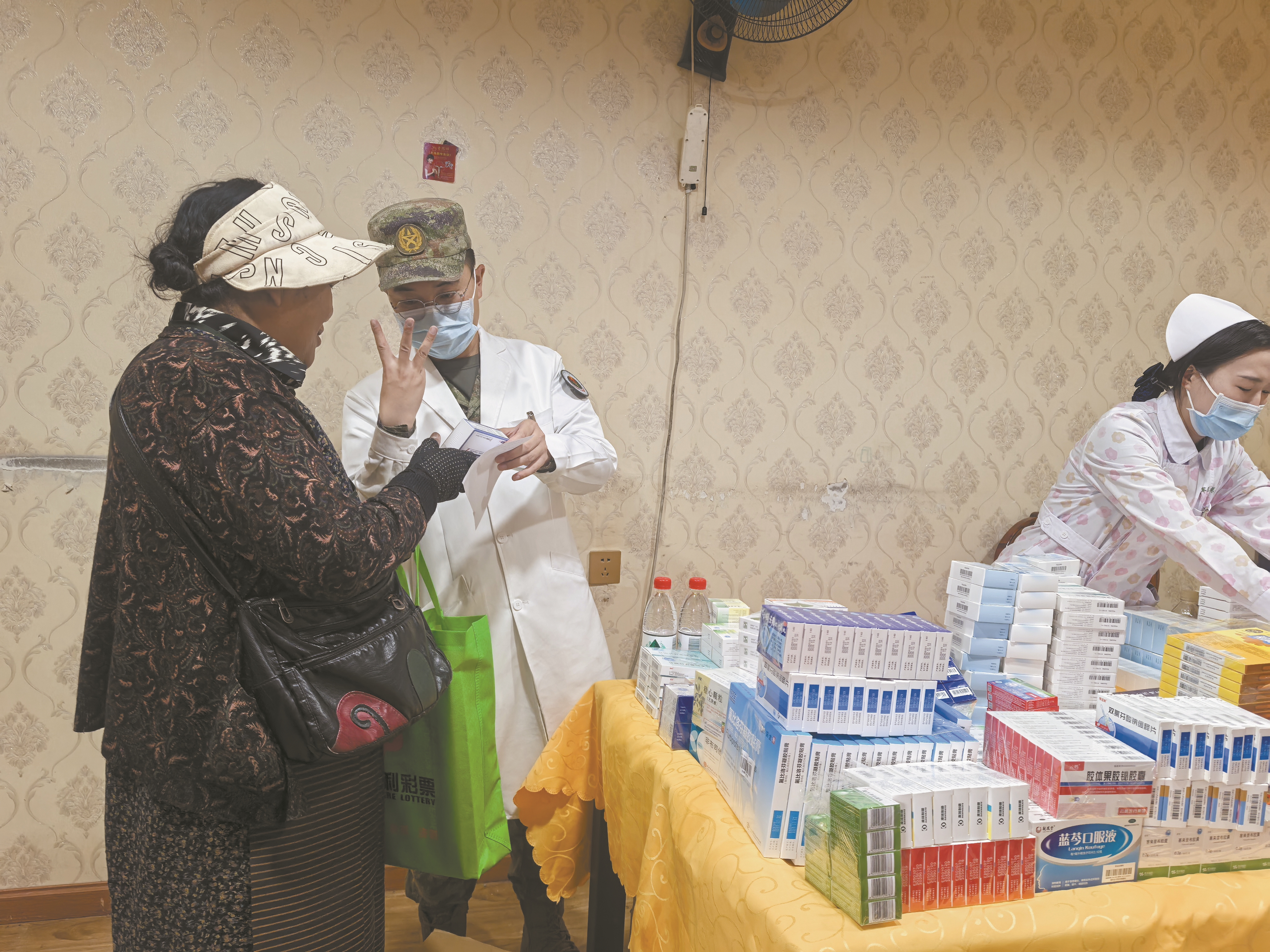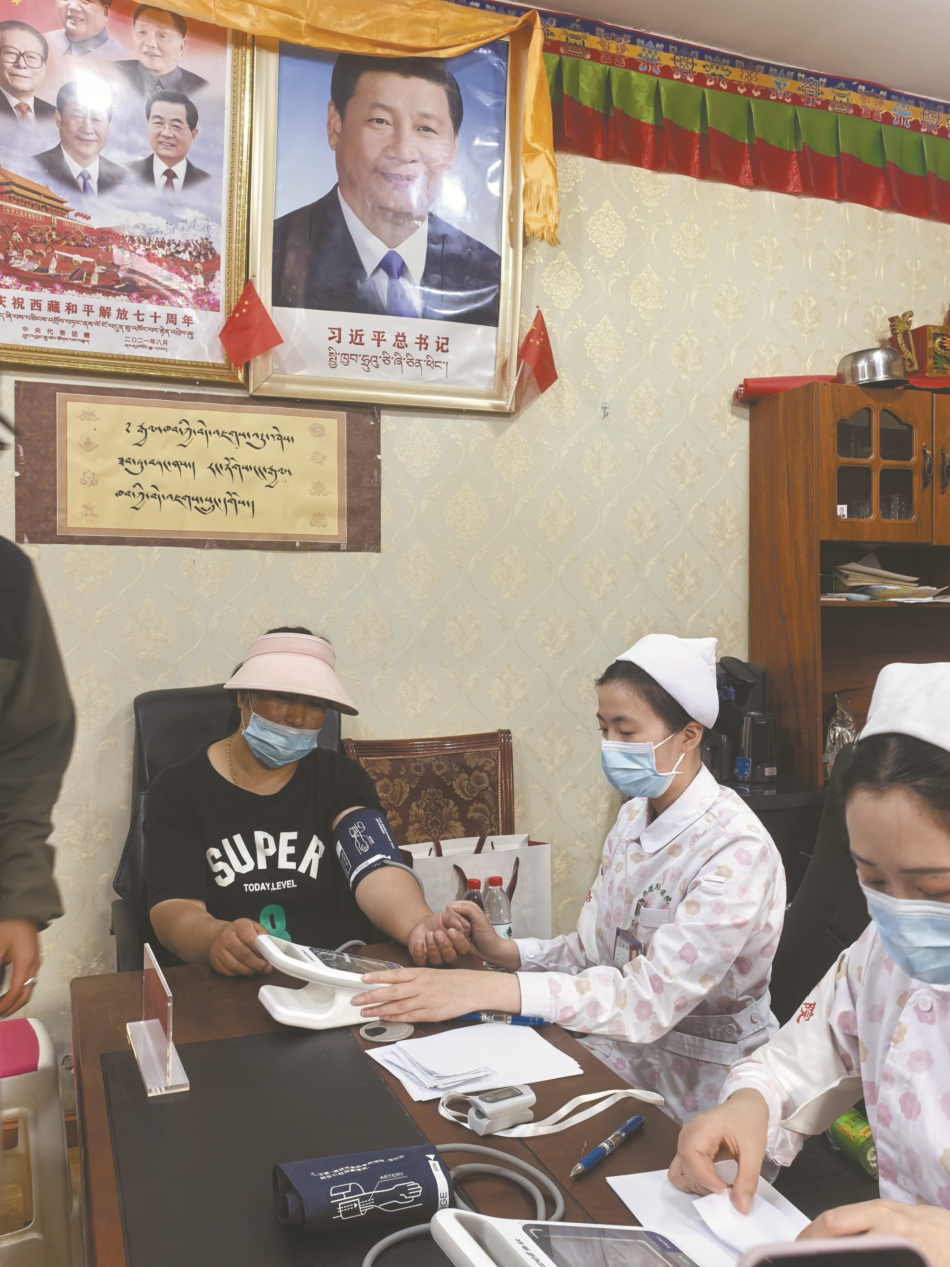 上图为西藏军区总医院医务人员给居民量血压。 左图为西藏军区总医院医务人员向居民发放药品并讲解服用剂量。 拉萨融媒记者 次仁卓玛摄