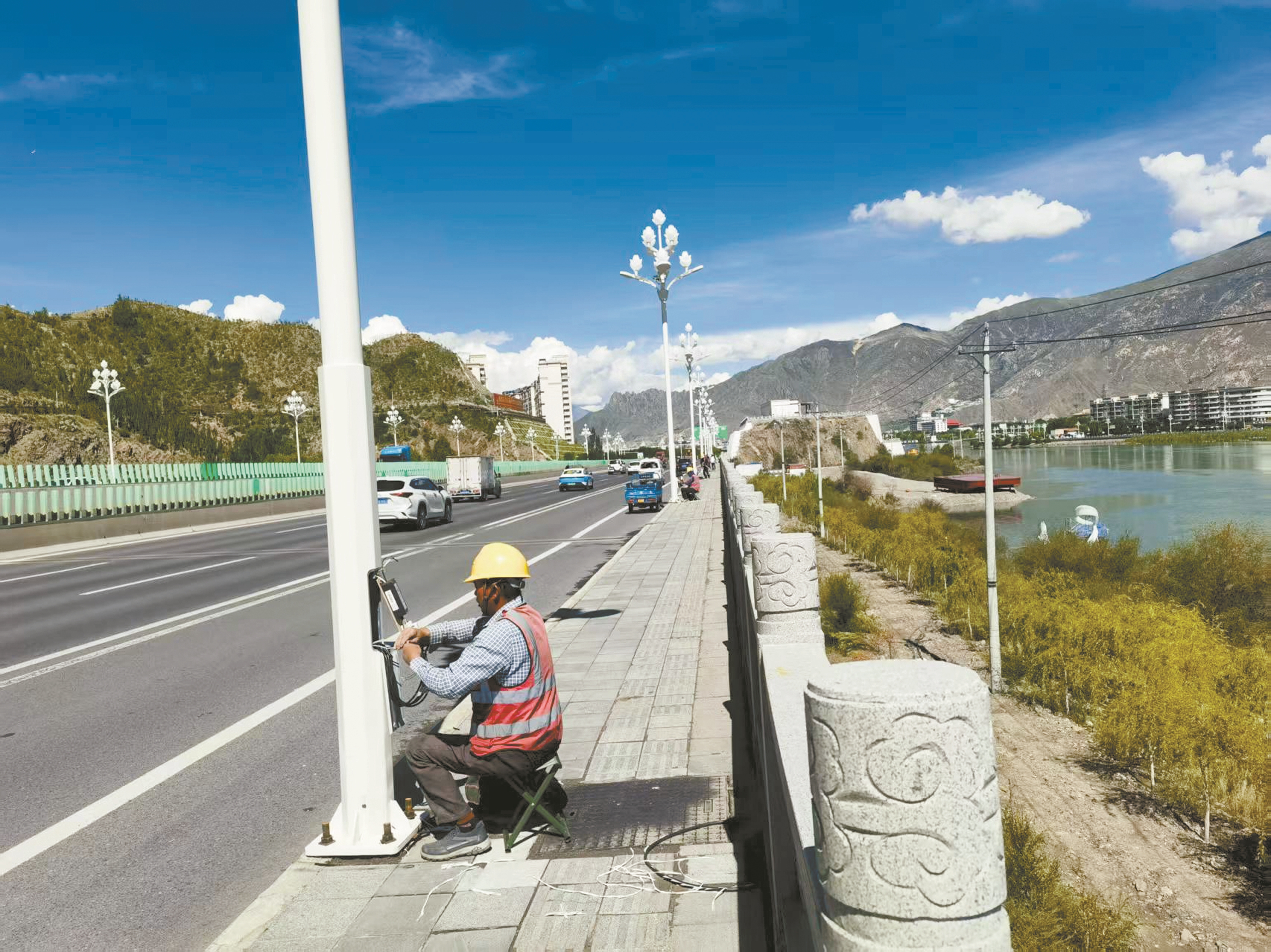 图为在南环路施工现场,施工人员为灯杆下方的智能控制板进行接线调试。 拉萨融媒记者 杨 璐摄