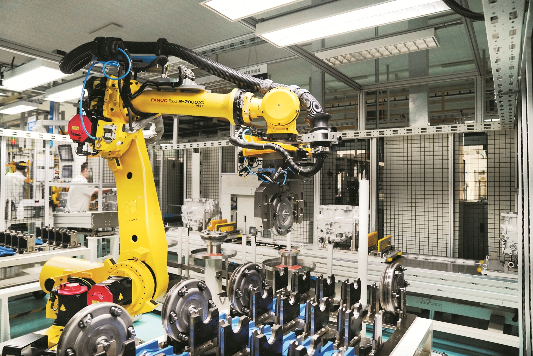 在哈尔滨东安汽车动力股份有限公司生产车间,工业机器人在生产作业(7月24日摄)。 新华社记者 王 松摄