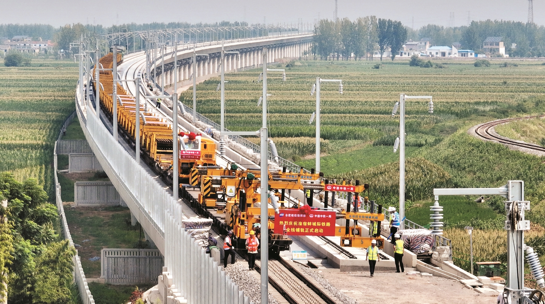 8月6日,在淮宿蚌城际铁路铺轨施工现场,中铁一局施工人员将首对500米长钢轨铺设在无砟轨道上,这标志着淮宿蚌城际铁路全线开始铺轨。