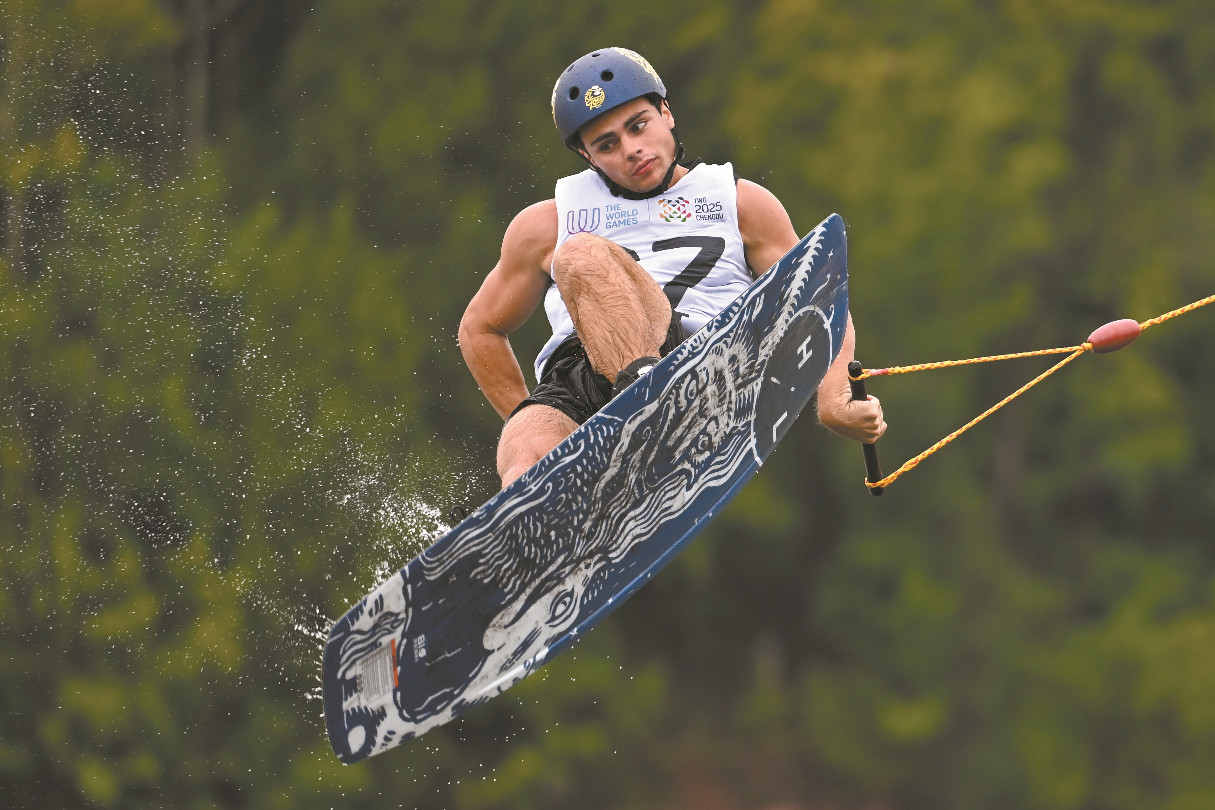 8月10日,2025年成都世运会男子索道滑水决赛在三岔湖桃花岛赛场举行。