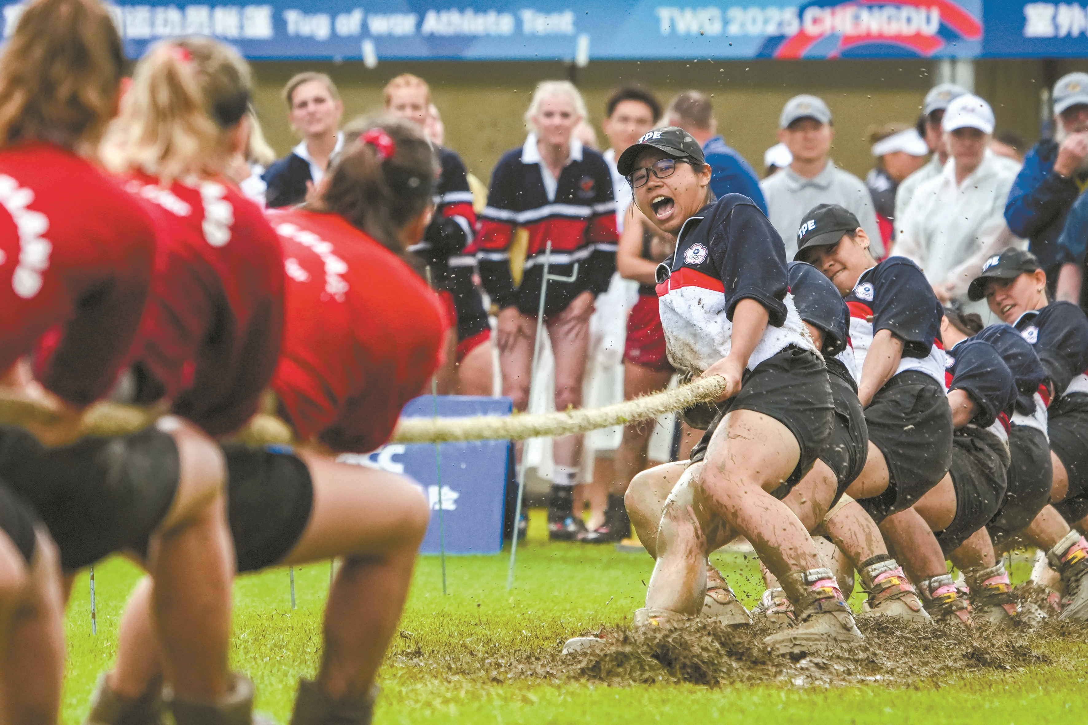 8月10日,2025年成都世运会女子室外拔河500公斤比赛在东安湖体育公园中央广场举行。