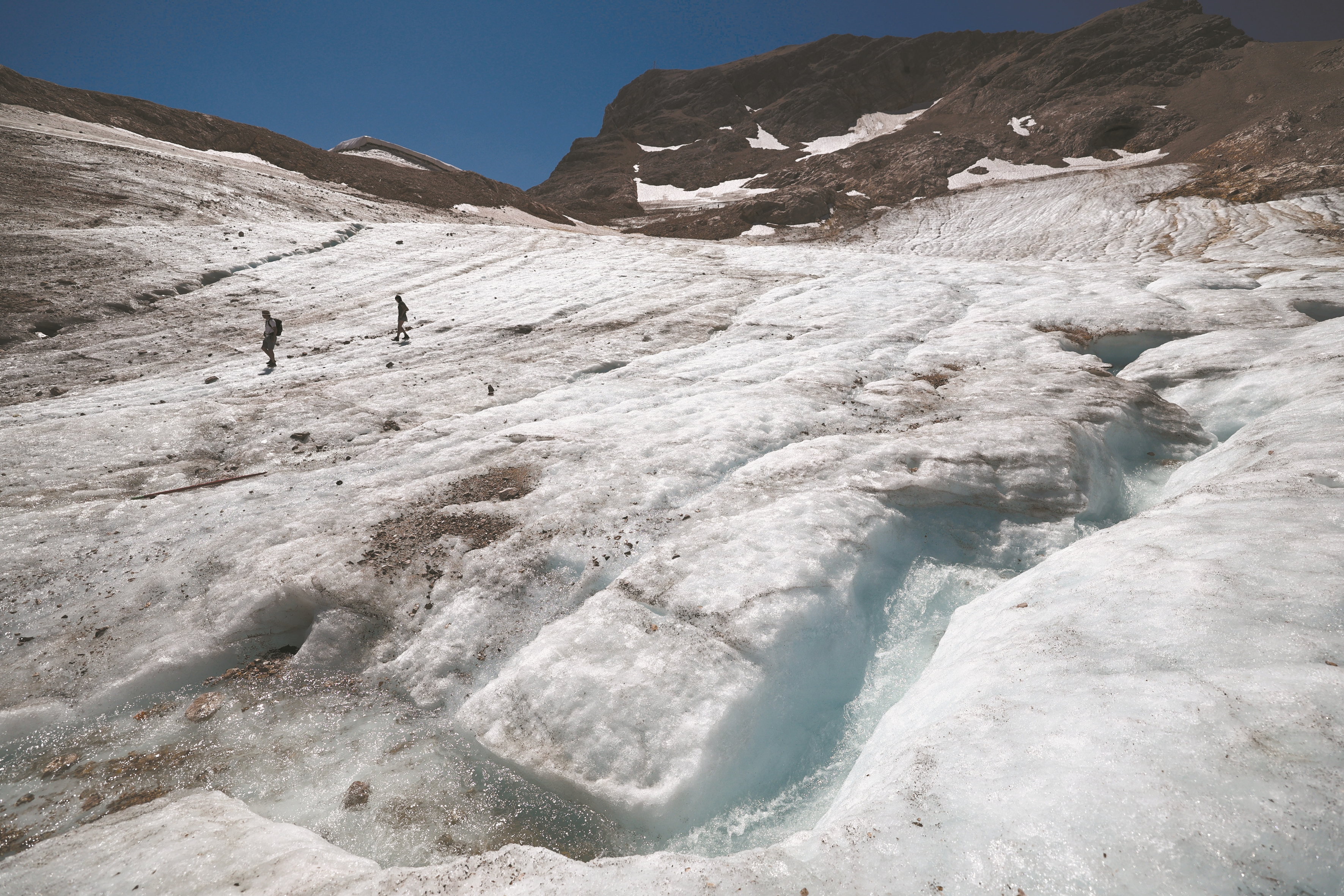 图为8月11日,在德国加米施-帕滕基兴附近,游客走在施内费纳冰川上。 (新华社发)