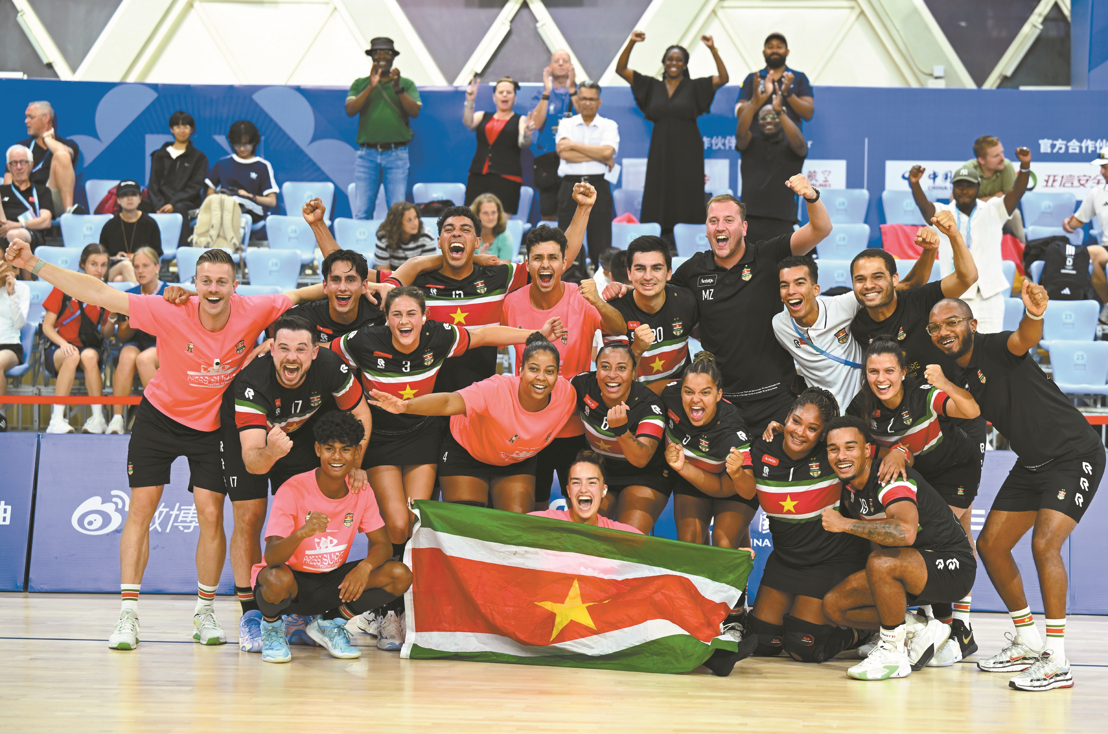 ▲8月12日,在2025年成都世运会荷球混合团体赛第五名争夺赛中,苏里南队战胜德国队。图为苏里南队在赛后合影。 (新华社发)