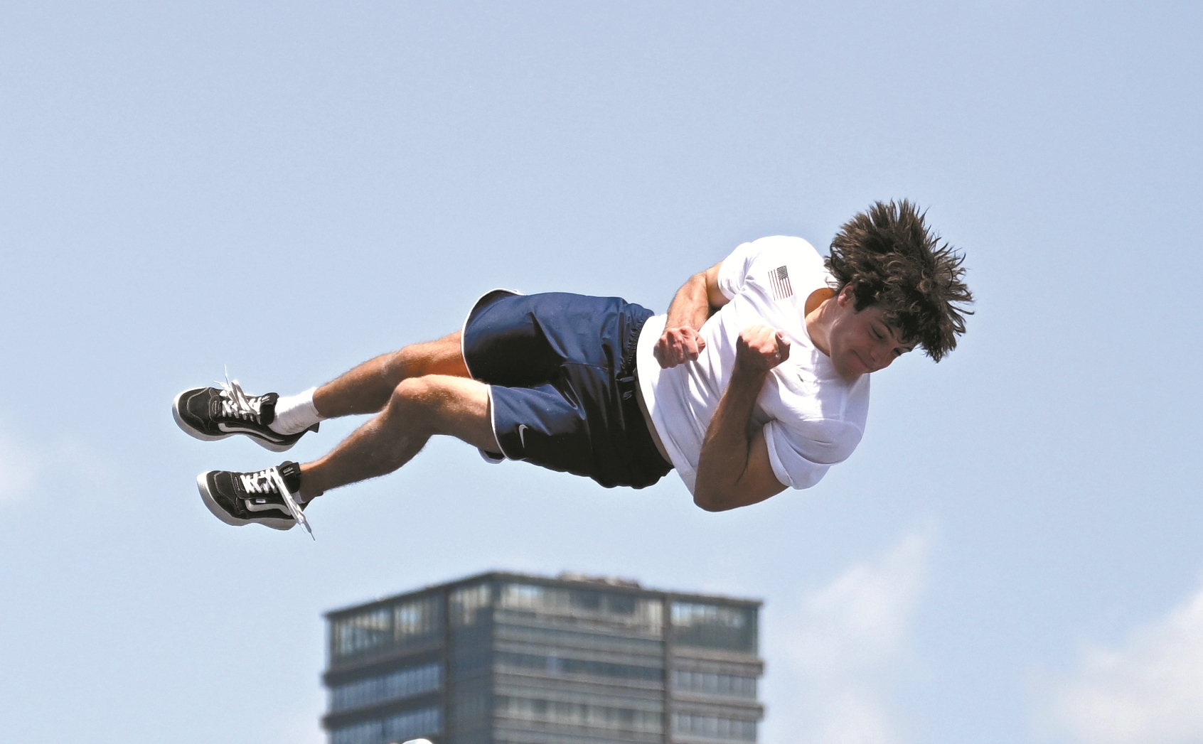 ?八月十二日,在二〇二五年成都世运会跑酷男子自由式资格赛预赛在兴隆湖湖滨赛场举行。图为美国选手鲁道夫在比赛中。他最终晋级决赛。(新华社发)