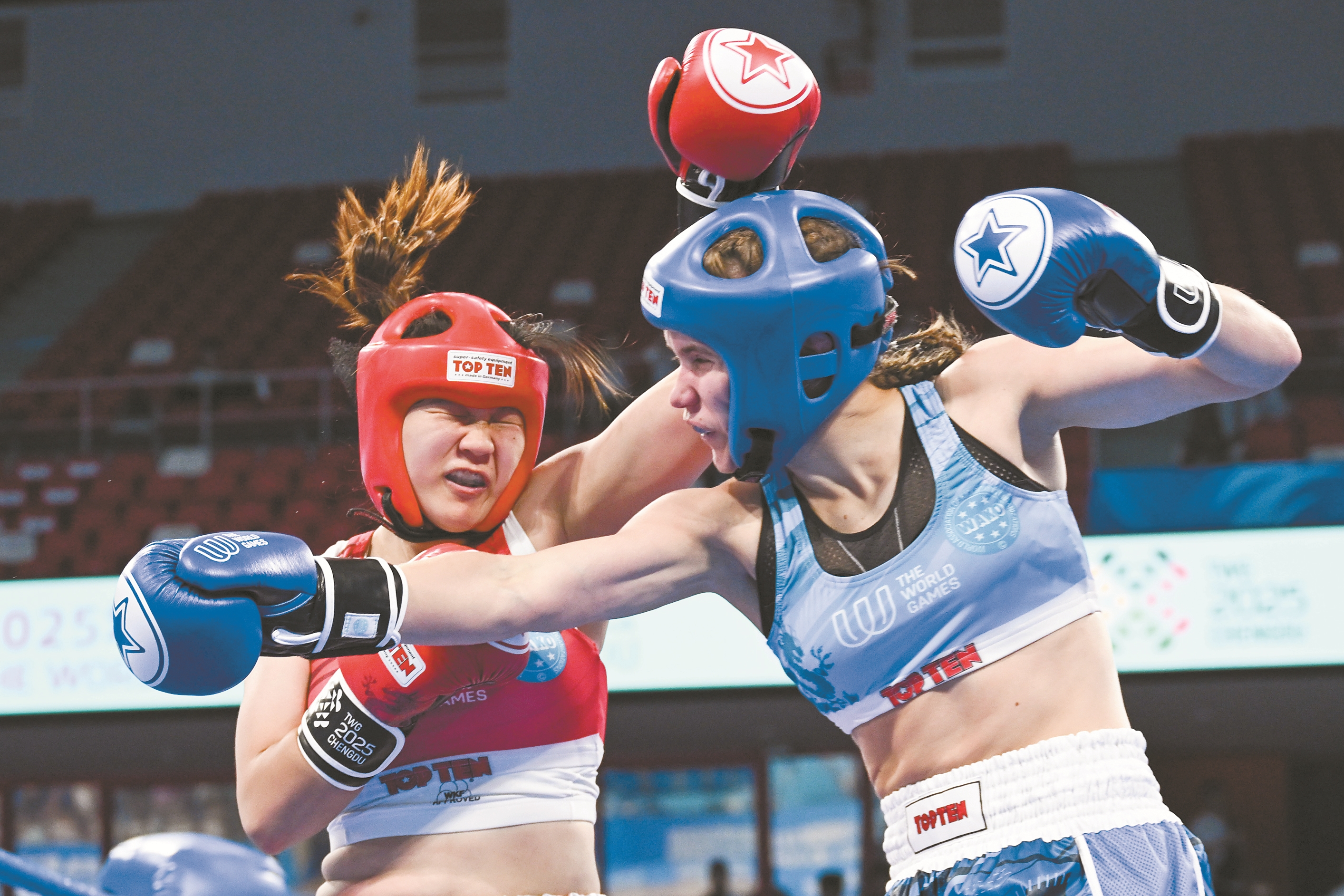 ▼8月12日,在2025年成都世运会自由搏击女子K1 60公斤级四分之一决赛中,中国选手徐婷婷不敌乌克兰选手马丁纽克,无缘半决赛。图为中国选手徐婷婷(左)在比赛中。(新华社发)