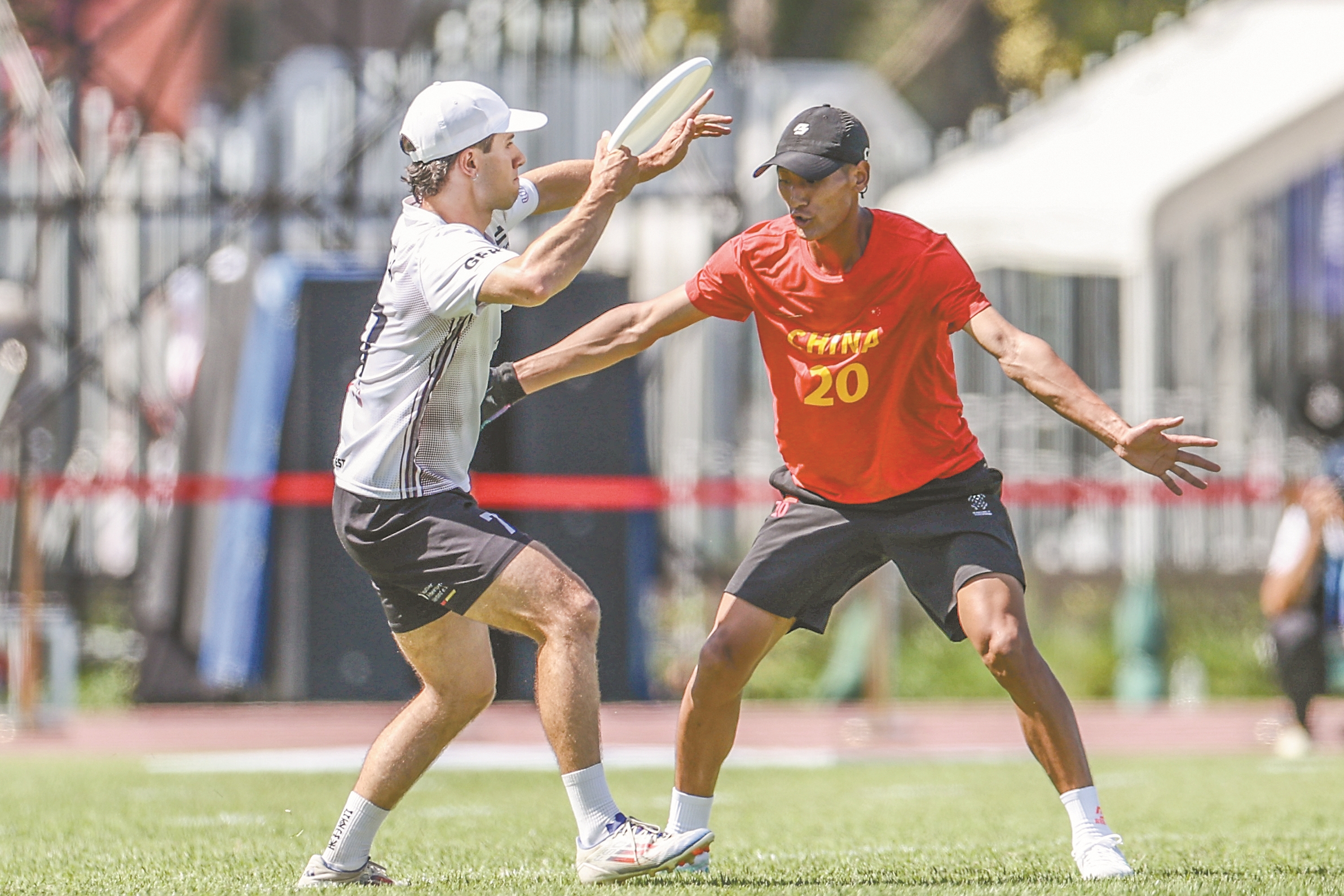 ?八月十二日,在二〇二五年成都世运会团队飞盘预赛A组中,中国队不敌德国队。 图为中国队选手毛权(右)在比赛中防守。 (新华社发)