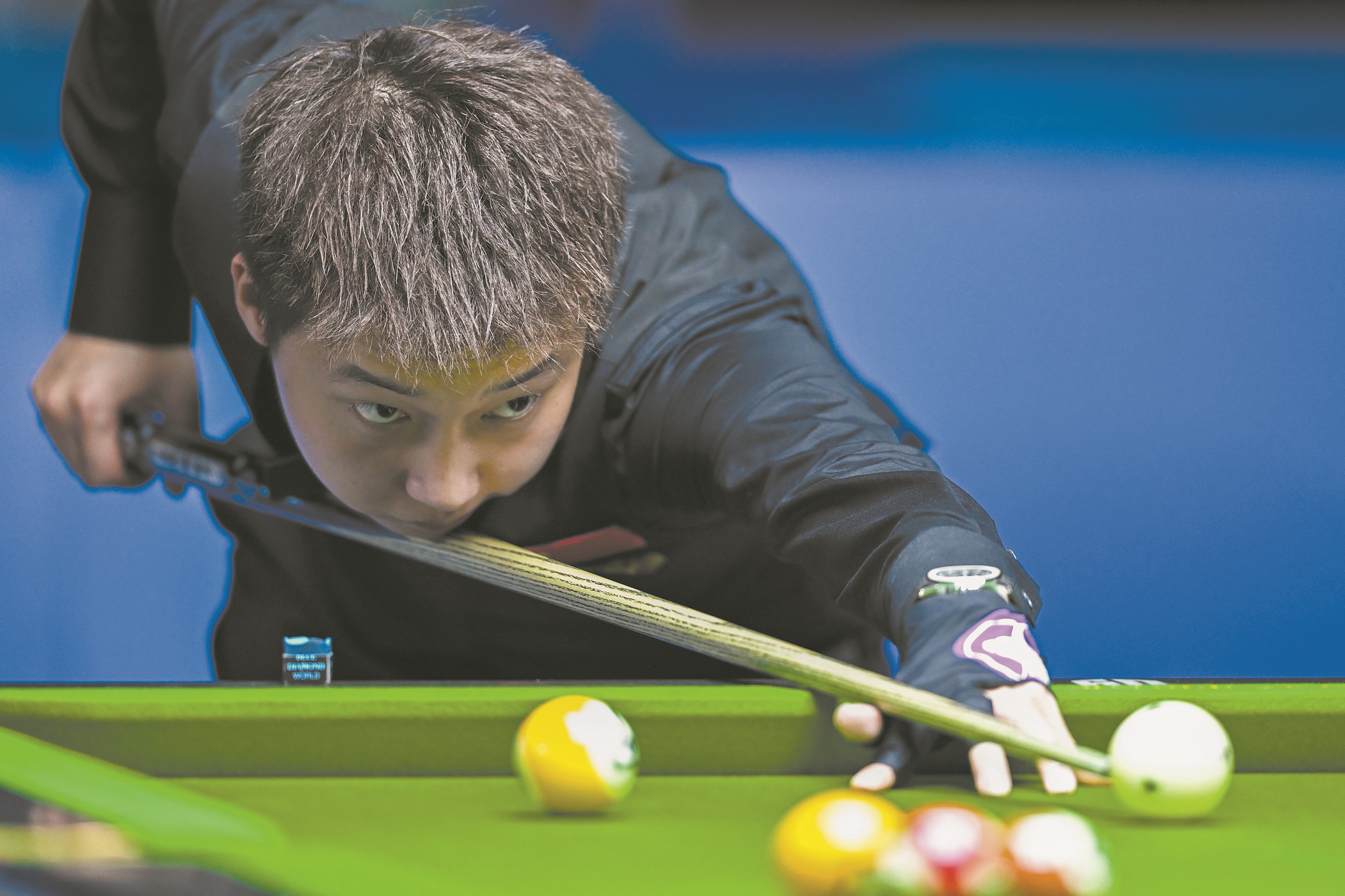 ?八月十二日,在二〇二五年成都世运会台球项目八球混合四分之一决赛中,中国选手张泰艺战胜另一位中国选手刘鑫,晋级四强。图为张泰艺在比赛中。 (新华社发)