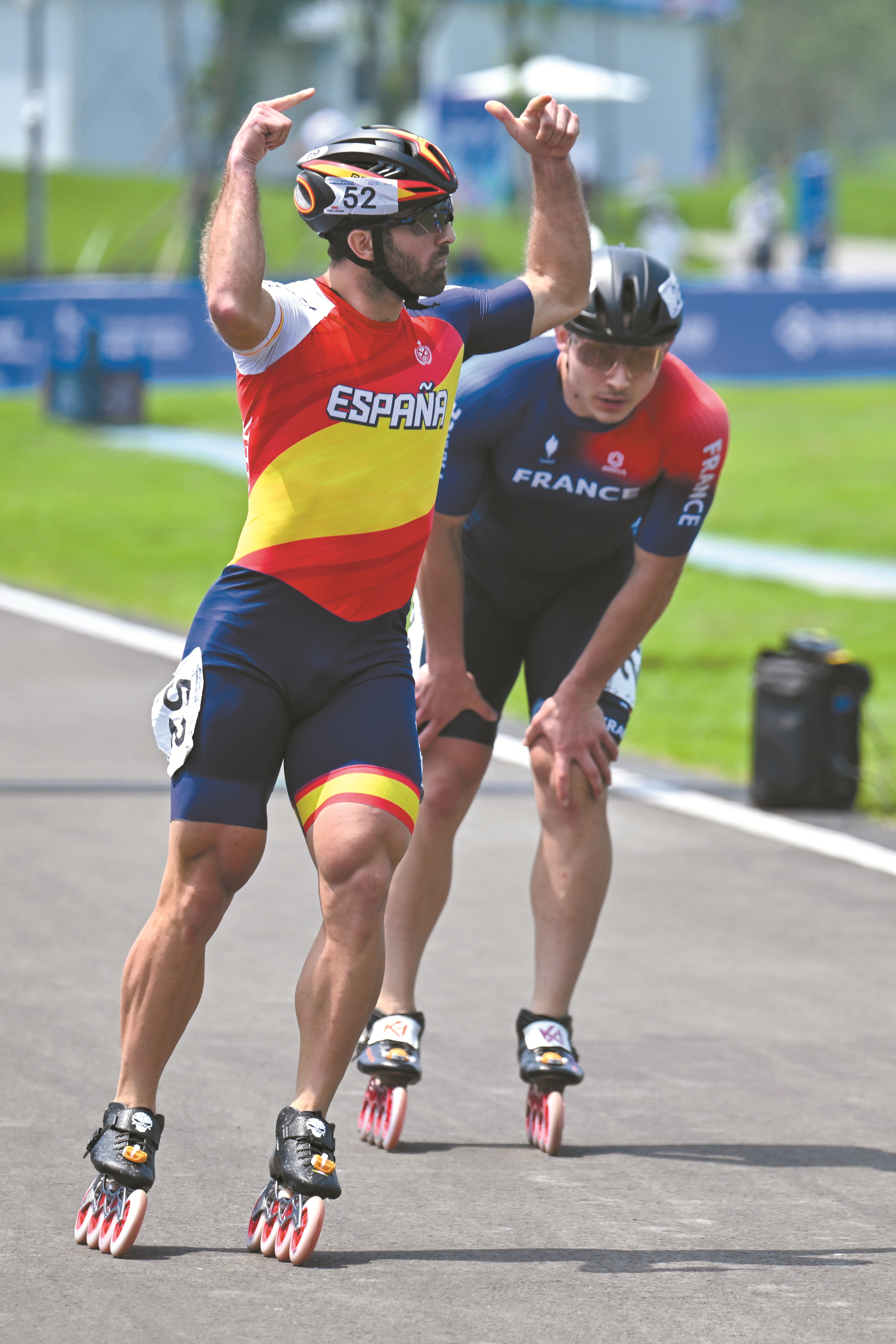 ▲8月12日,在2025年成都世运会速度轮滑公路赛男子公路赛(单圈争先)决赛中,西班牙队选手古斯曼获得冠军,哥伦比亚队选手塔斯孔和法国队选手伊万分获亚军和季军。 图为西班牙队选手古斯曼在比赛后庆祝。 (新华社发)