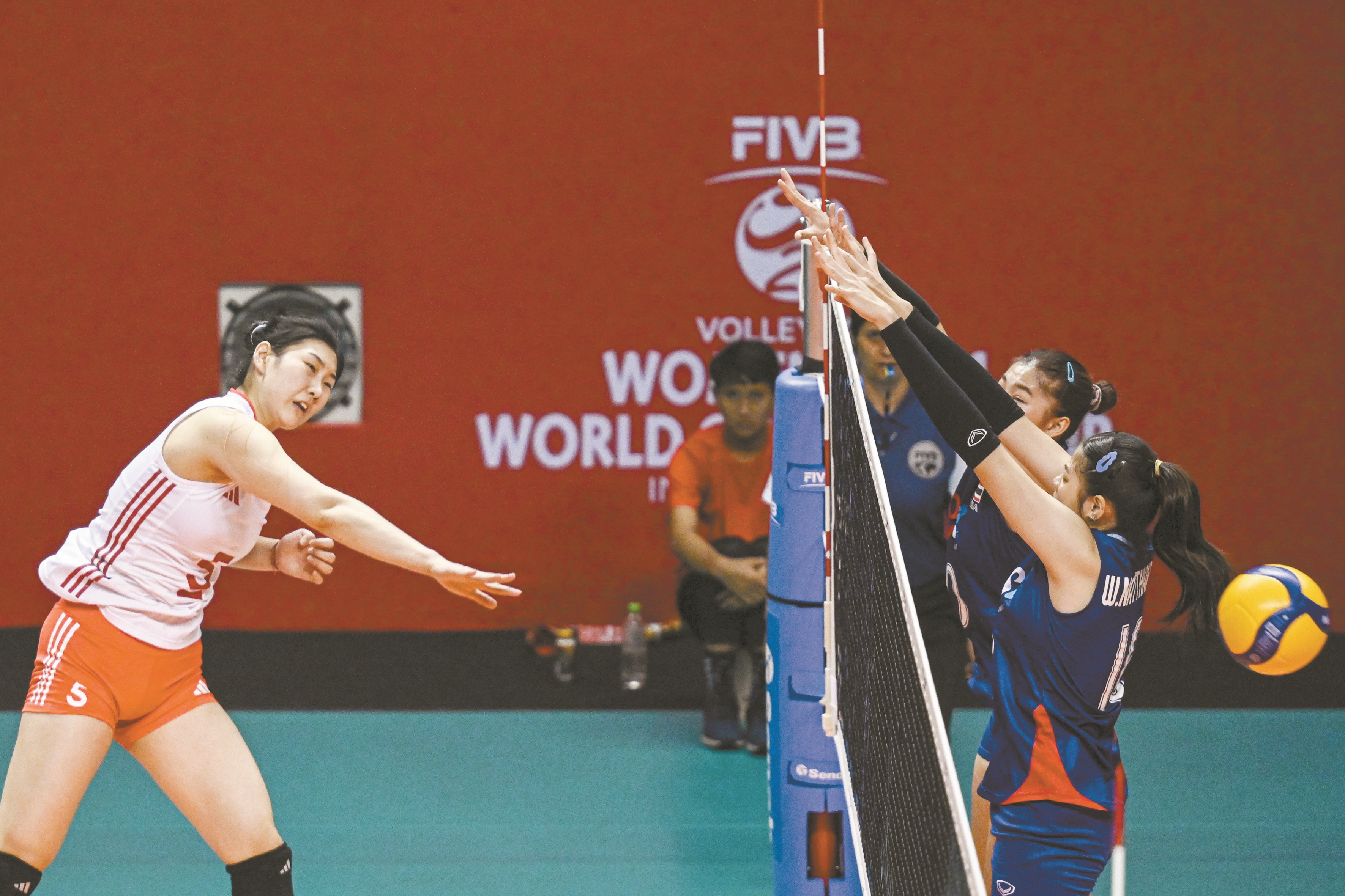 图为中国队球员李晨瑄(左一)在比赛中扣球。(新华社发)