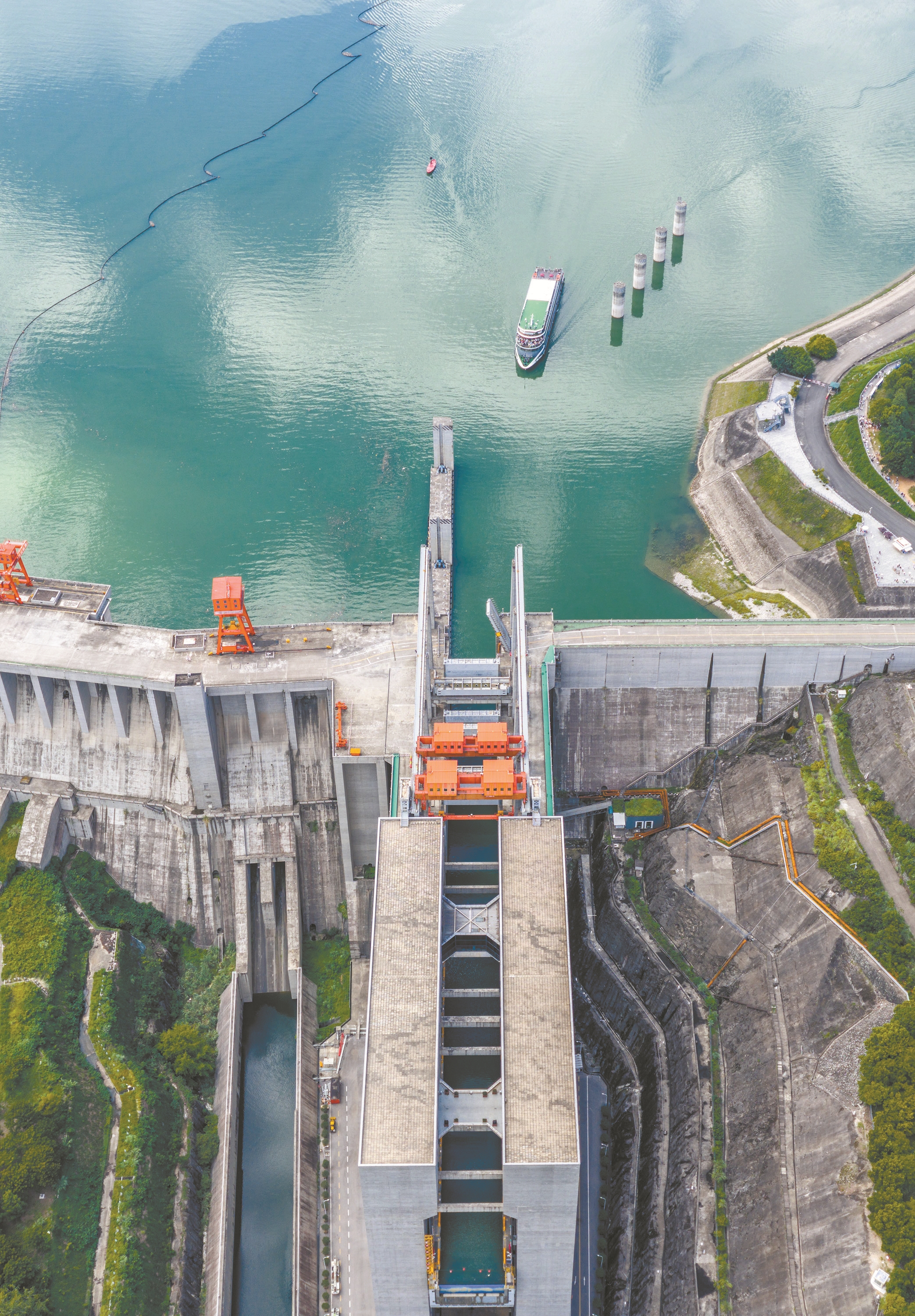 ?这是8月16日,在湖北省宜昌市,下行游船长江三峡5号通过三峡升船机(无人机照片)。(新华社发)