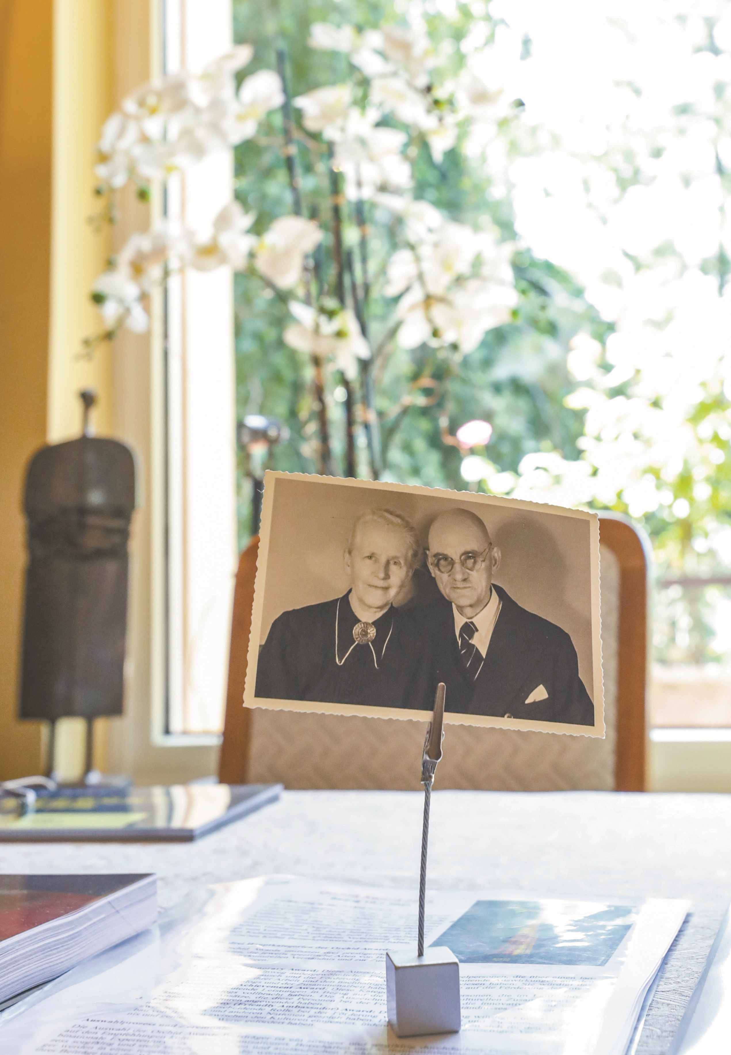 这张八月七日拍摄的照片展示的是德国海德堡约翰·拉贝交流中心内拍摄于一九四七年的约翰·拉贝与夫人多拉·拉贝合影。 新华社记者 张 帆摄