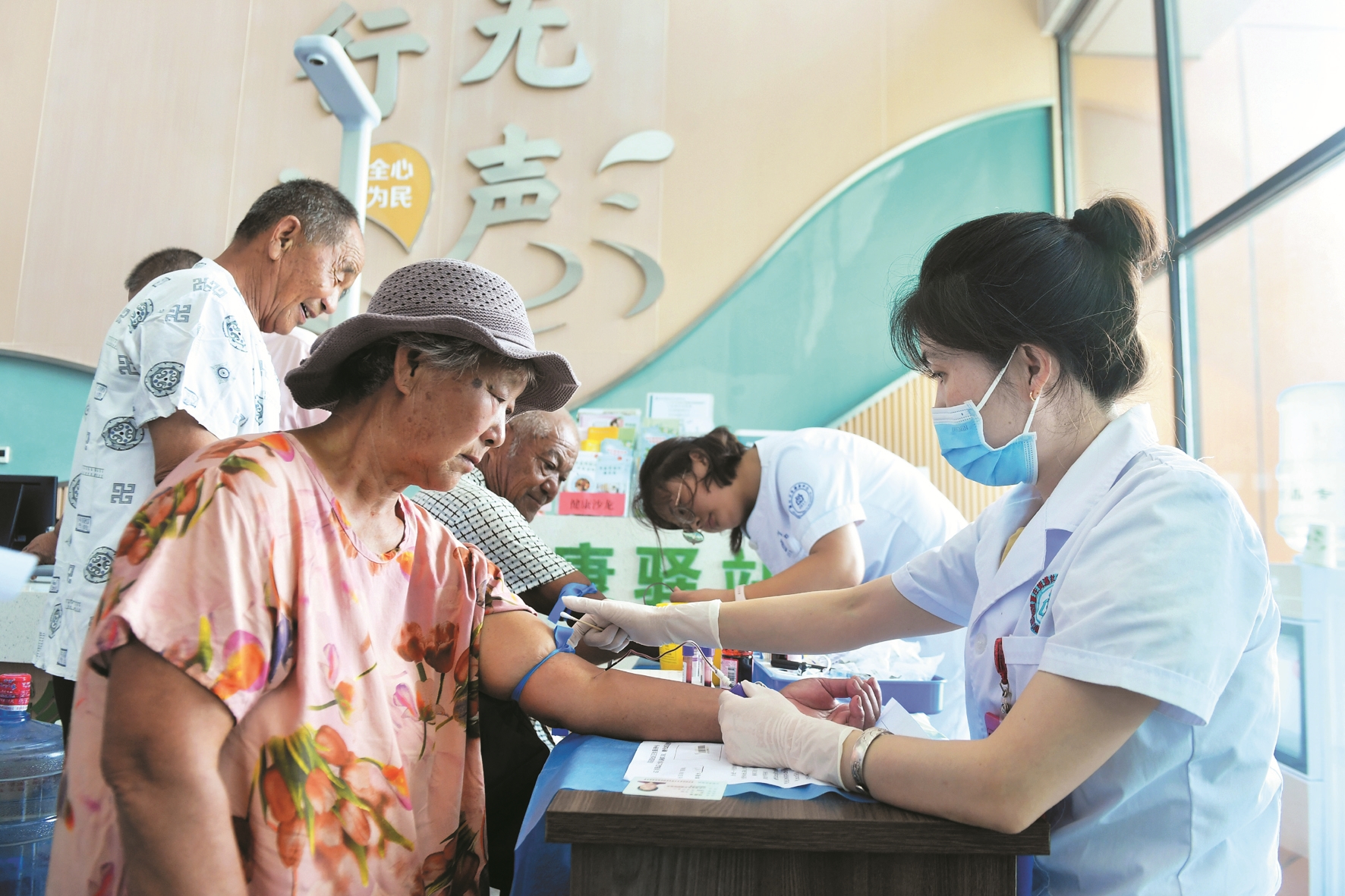 图为8月18日,在山东省青岛市城阳区夏庄街道社区卫生服务中心,医生为社区居民义诊。 (新华社发)