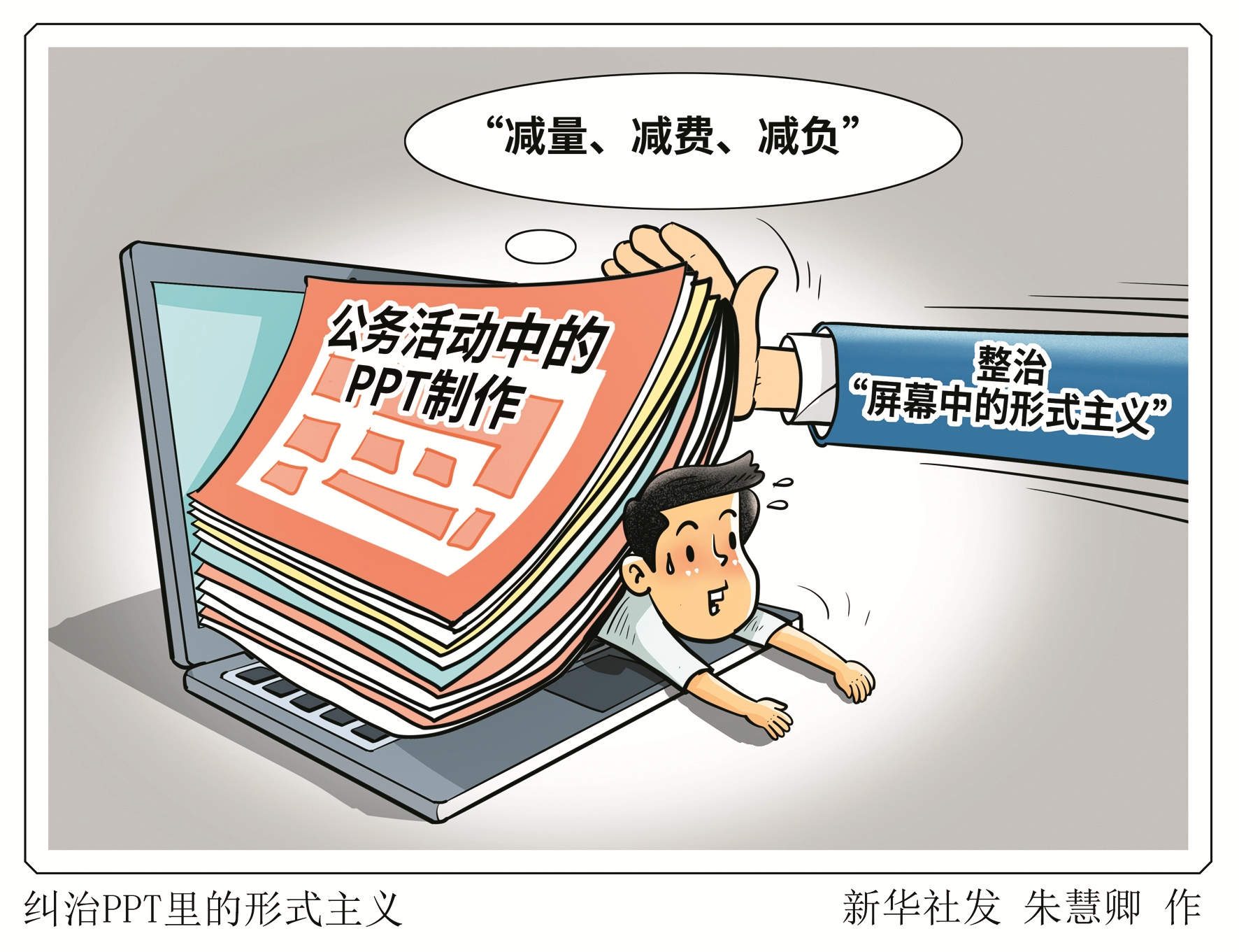 中共中央办公厅、国务院办公厅印发《整治形式主义为基层减负若干规定》,并发出通知指出,形式主义、官僚主义是顽瘴痼疾,必须下大力气坚决纠治。近来,一些地方部署开展“屏幕中的形式主义”专项整治行动,推动公务活动中的PPT制作“减量、减费、减负”,基层干部群众对此纷纷点赞。但从近期通报的案例看,仍有一些单位将PPT汇报形式的好坏作为考核评价依据之一,甚至找第三方机构进行制作,加重基层负担,助长华而不实的工作作风。