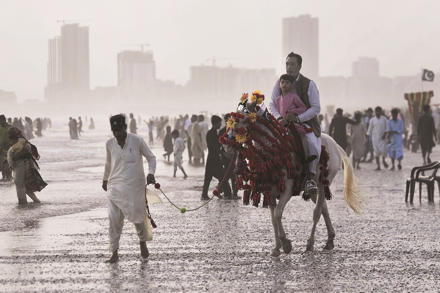 图为8月17日,人们在巴基斯坦卡拉奇的海滩骑马游玩。
