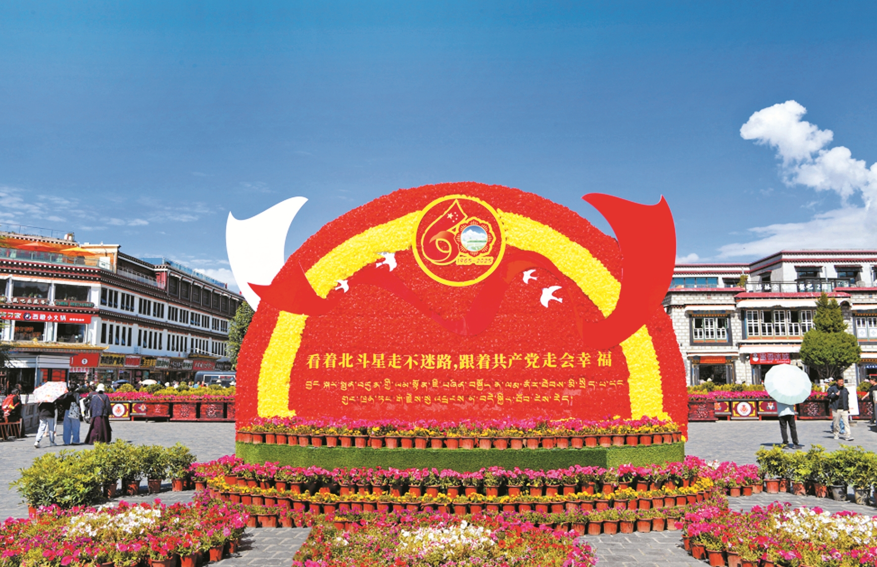 图为大昭寺广场上的大庆主题花卉。