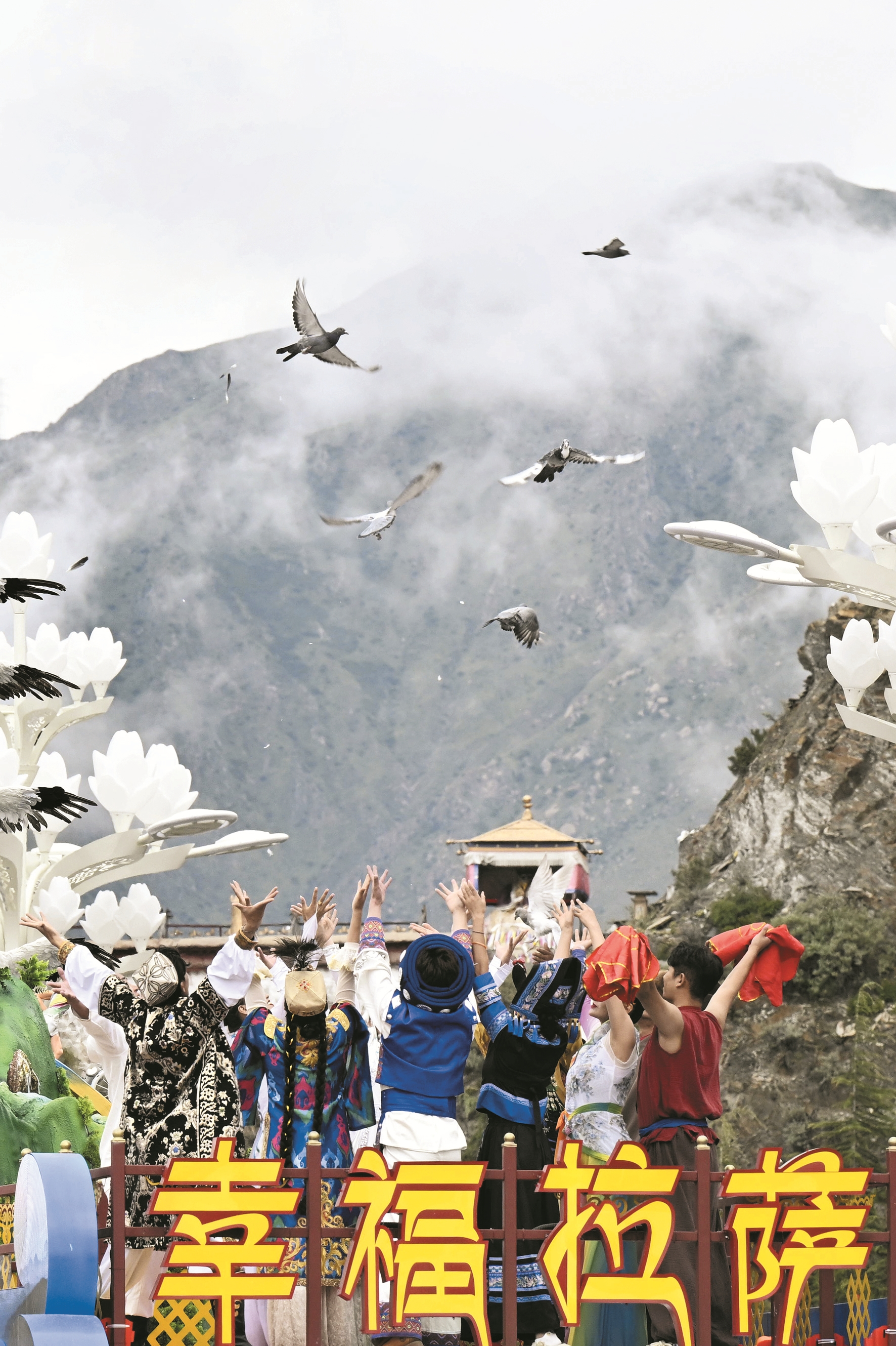 图③为彩车上的演员通过布达拉宫广场时放飞鸽子。