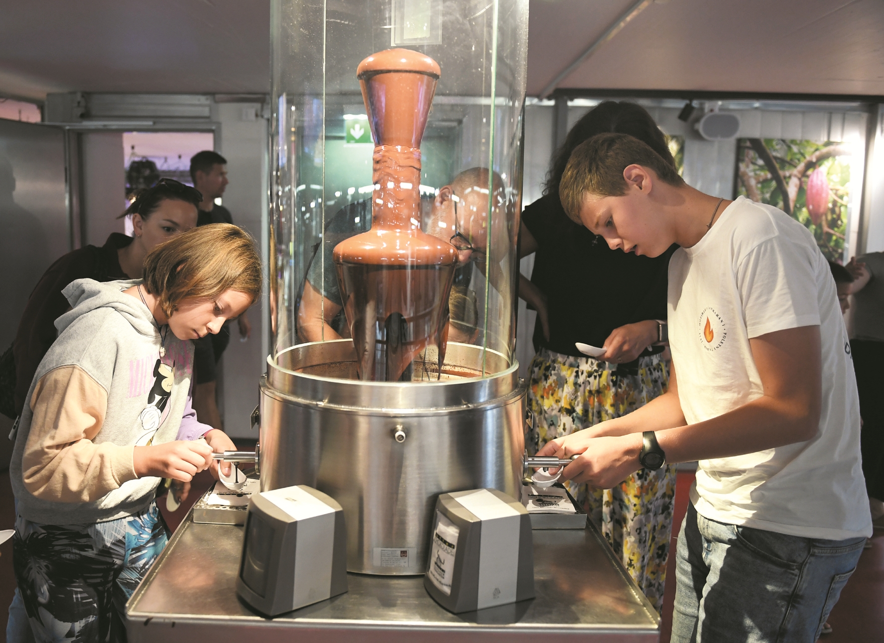 图为八月六日,在奥地利贝格尔,游客在珍得巧克力剧院准备品尝巧克力。 (新华社发)