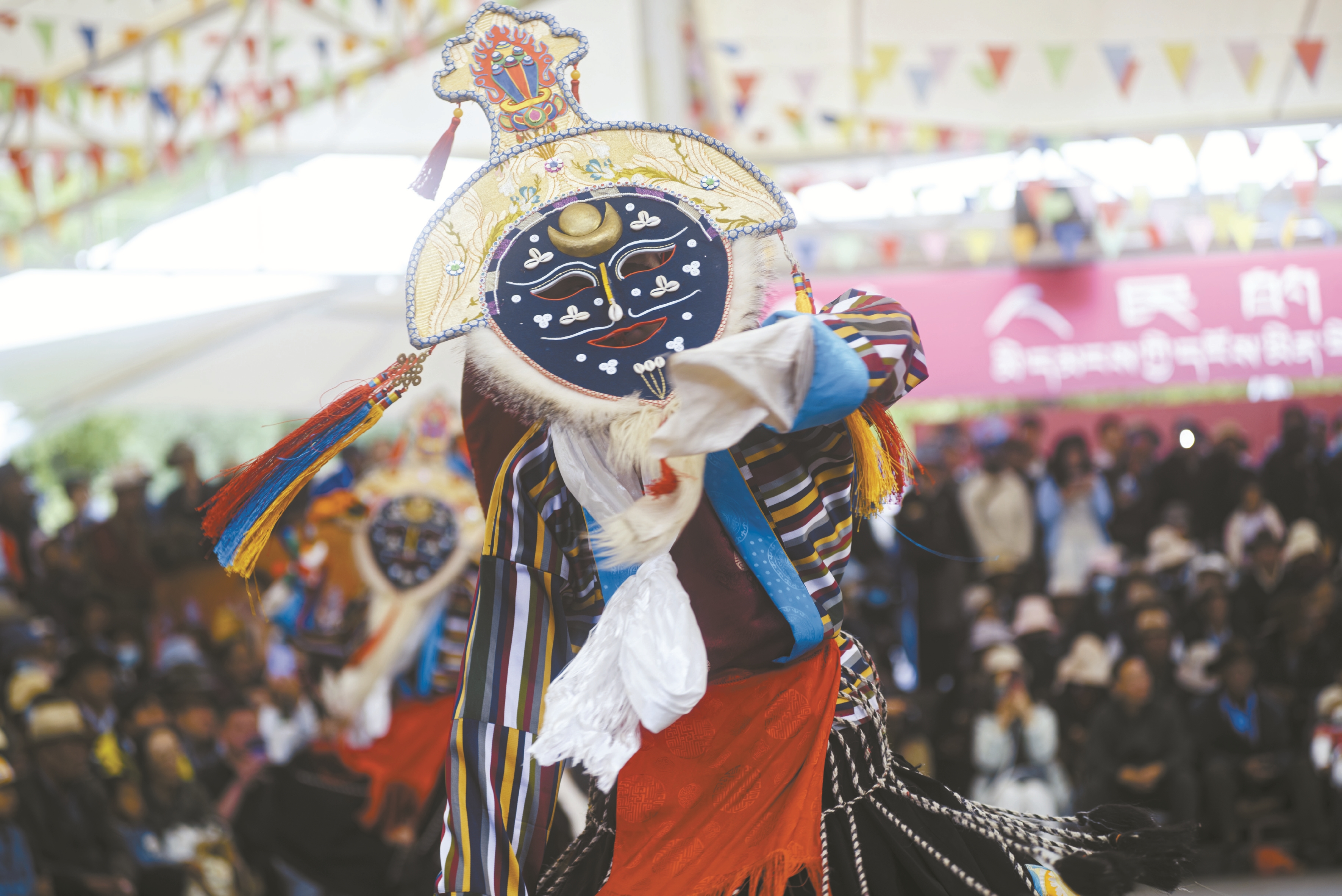 公园内,传统藏戏《白玛雯巴》正在上演。舞台上,演员们身着华丽戏服,面具色彩斑斓,歌声嘹亮,舞姿矫健。