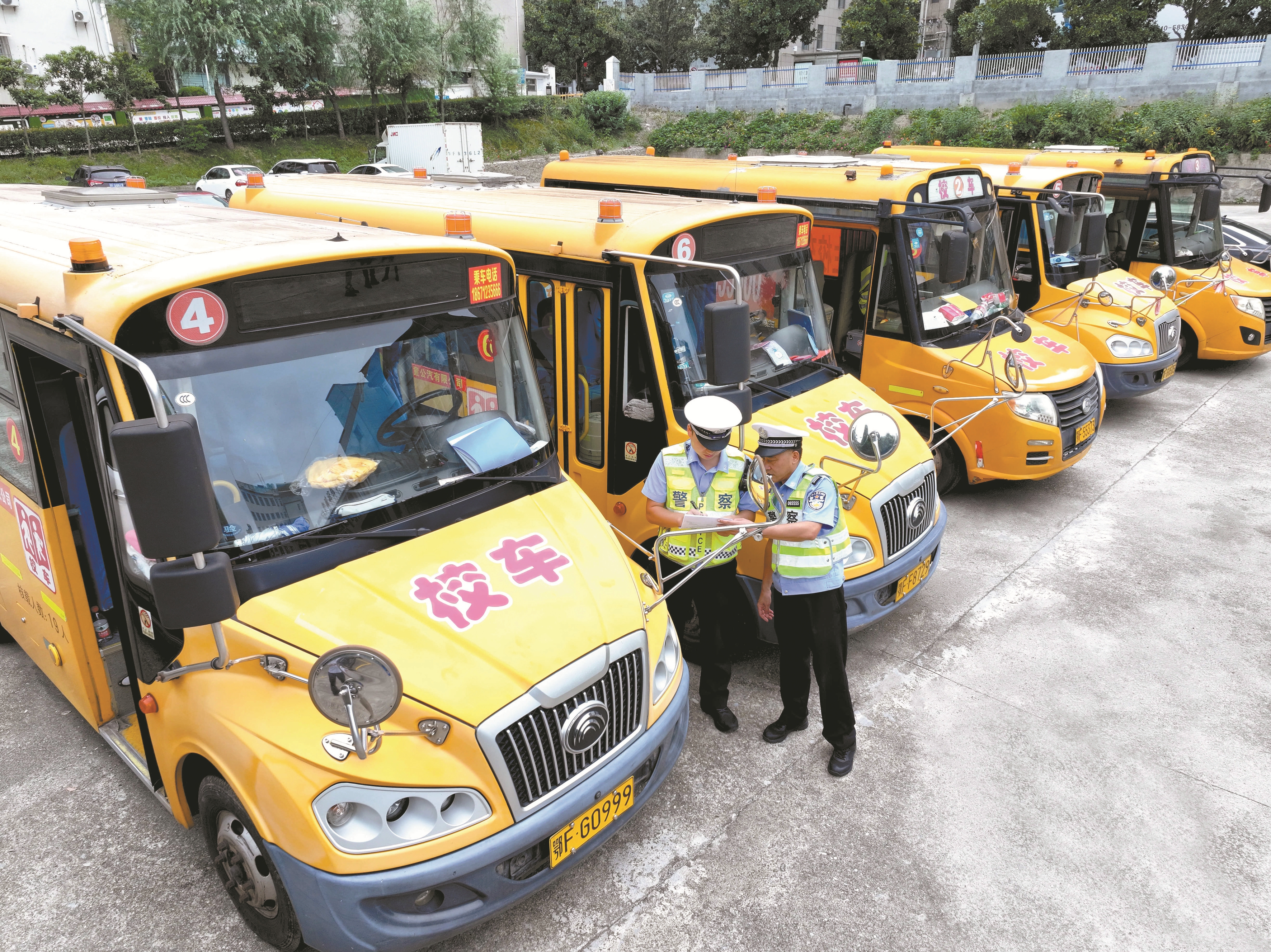 图为8月25日,湖北省襄阳市保康县公安局交警大队民警对校车进行安全检查(无人机照片)。 (新华社发)