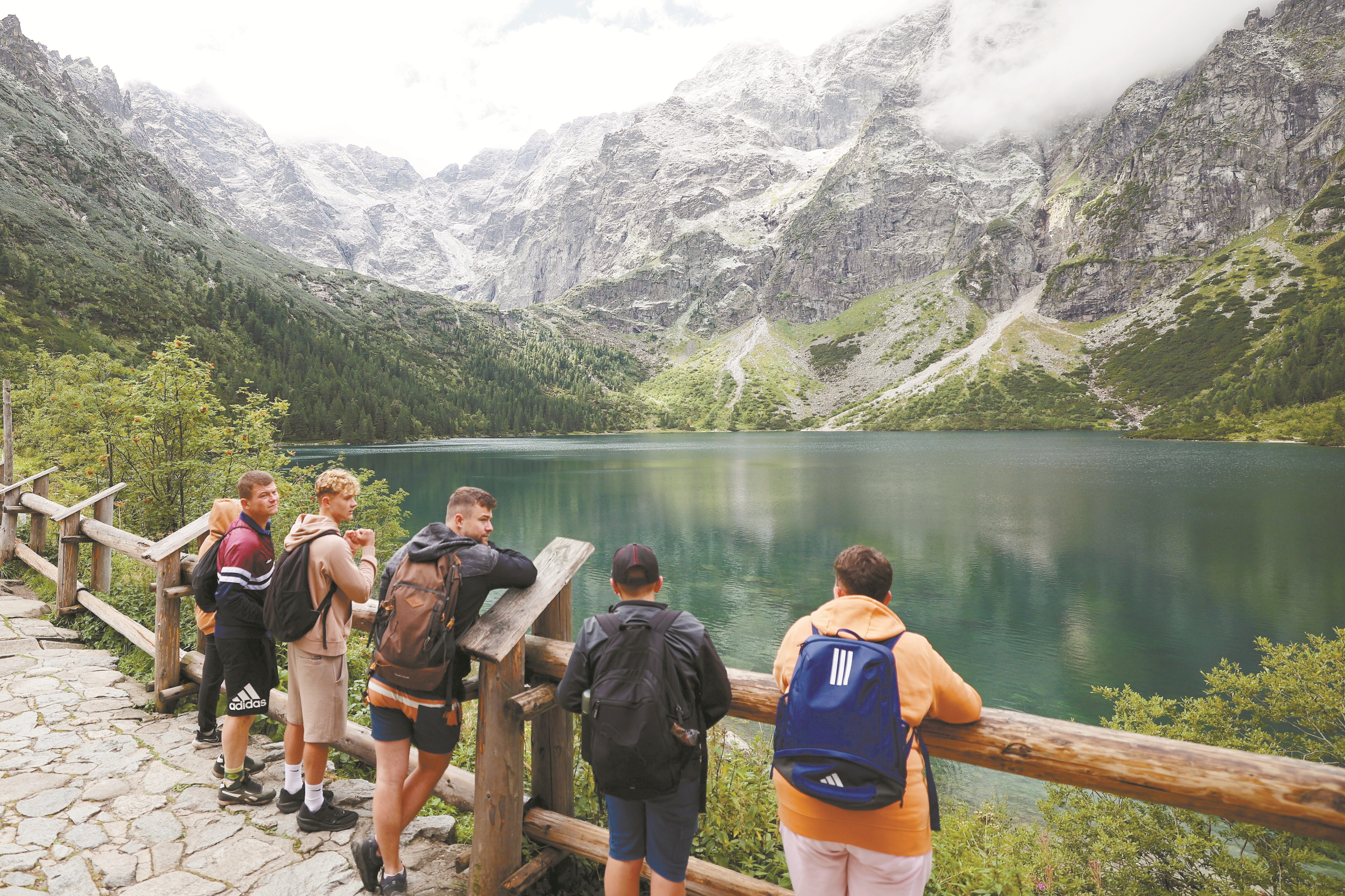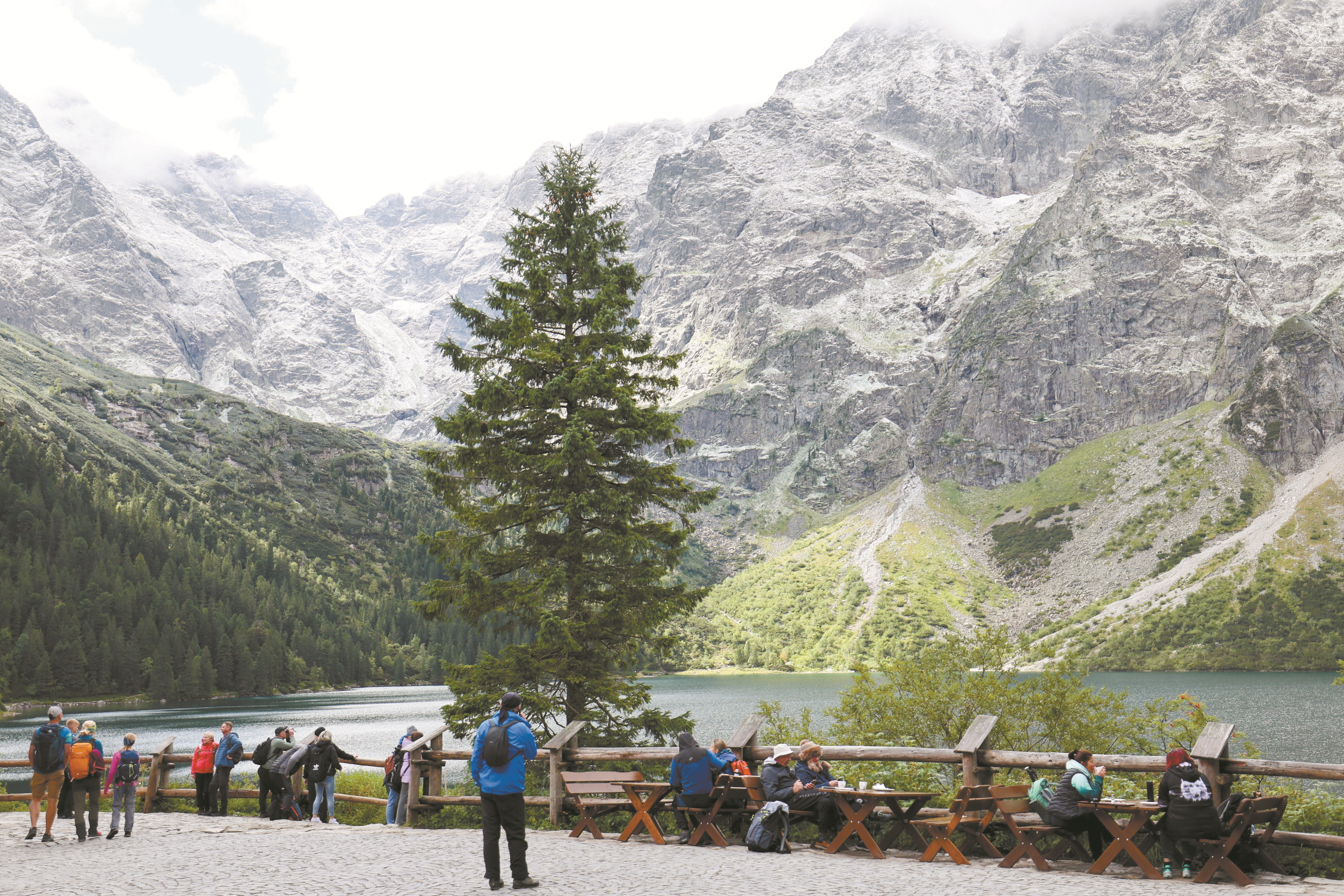 图②、图③、图④:8月24日,在波兰南部扎科帕内附近,游客注视着塔特拉山脉“海洋之眼”湖上方峰顶出现的降雪。 (新华社发)