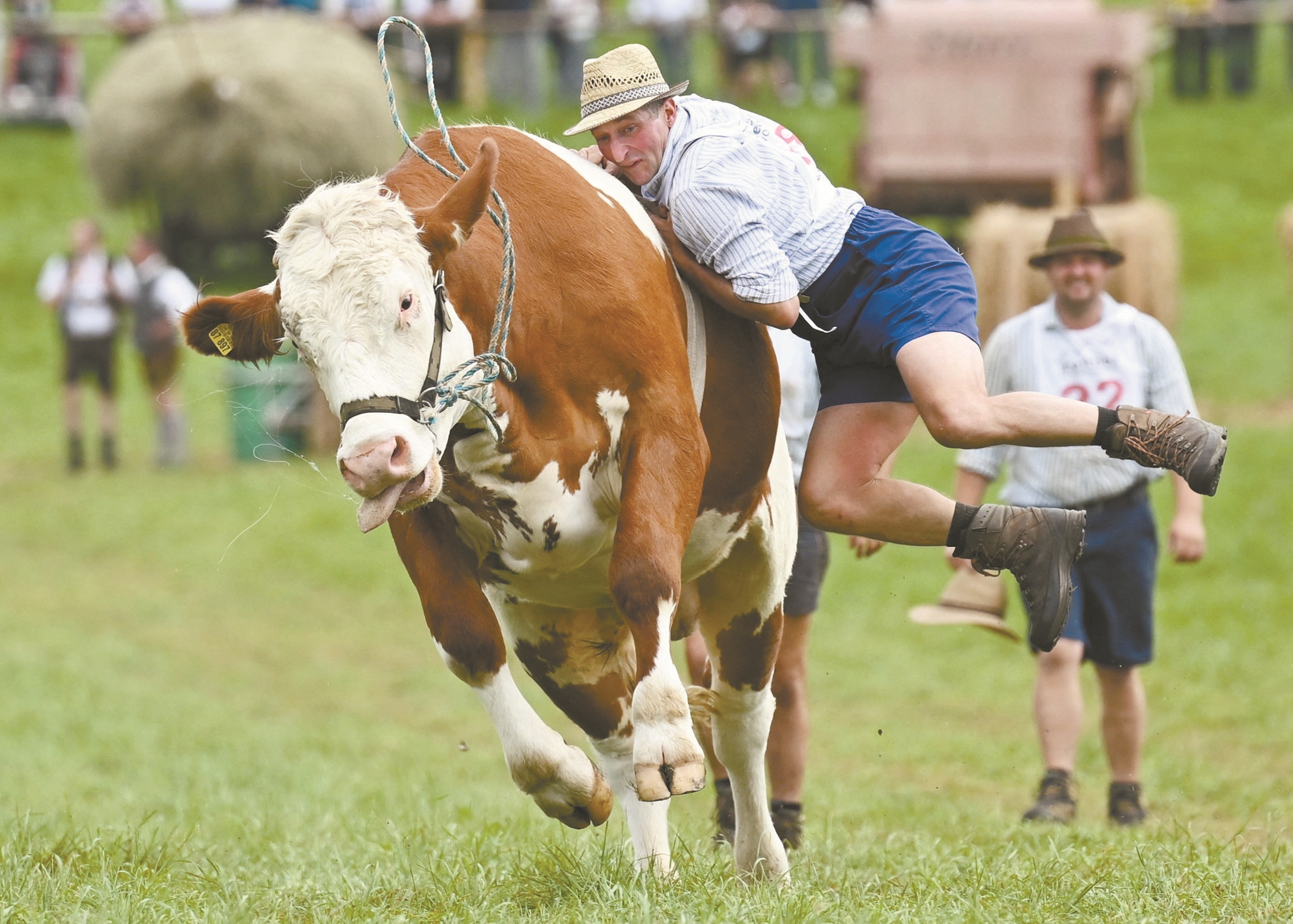 图为8月24日,在德国巴伐利亚州南部一处村庄,一名男子参加骑牛比赛。