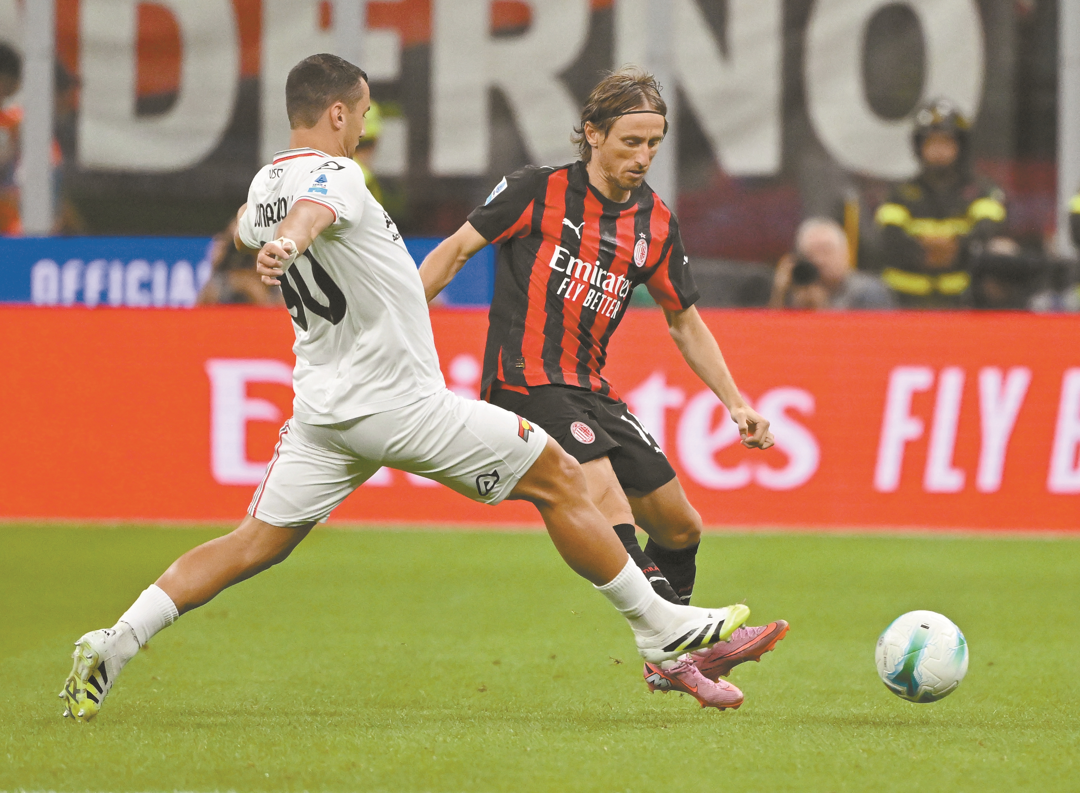 图为23日,AC米兰队球员莫德里奇(右)与克雷莫内塞队球员博纳佐利在比赛中拼抢。(新华社发)