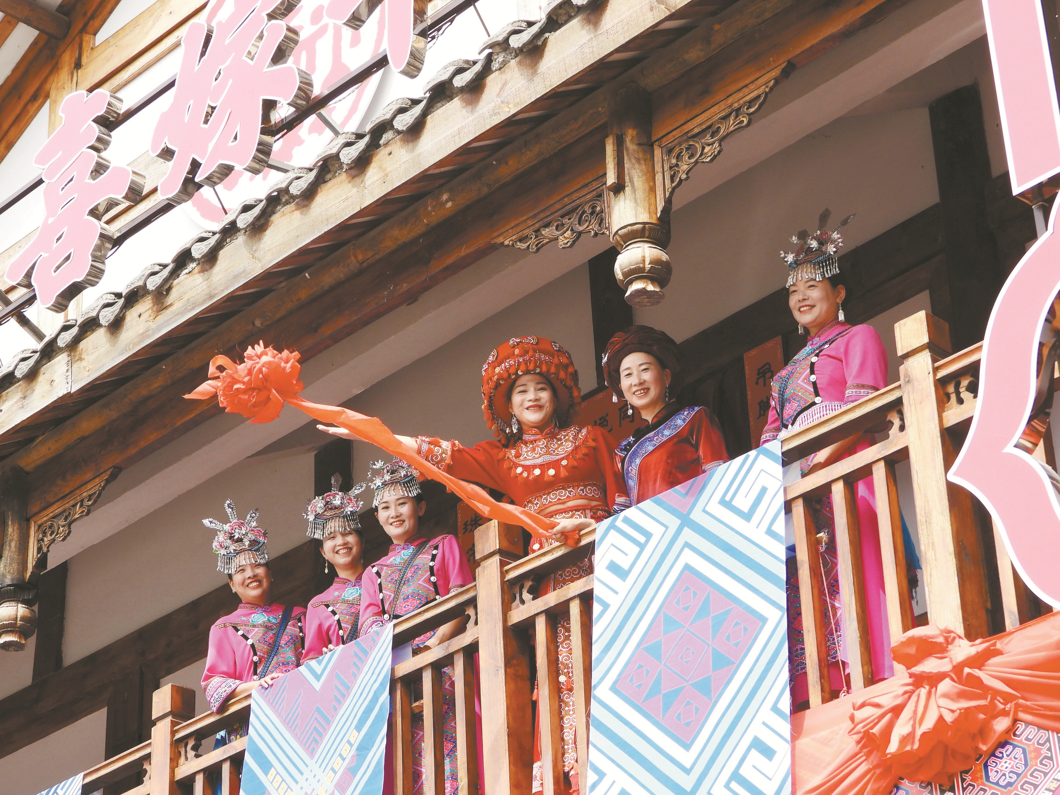 图为8月26日,在四川省达州市巴山大峡谷景区,演员为游客表演迎七夕土家族婚嫁民俗。 (新华社发)
