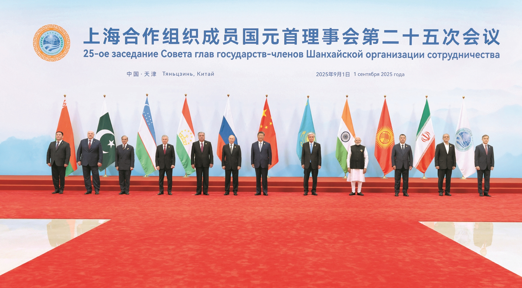 9月1日上午,上海合作组织成员国元首理事会第二十五次会议在天津梅江会展中心举行。中国国家主席习近平主持会议并发表题为《牢记初心使命 开创美好未来》的重要讲话。这是习近平同出席会议的上海合作组织成员国领导人、常设机构负责人集体合影。 新华社记者 黄敬文摄