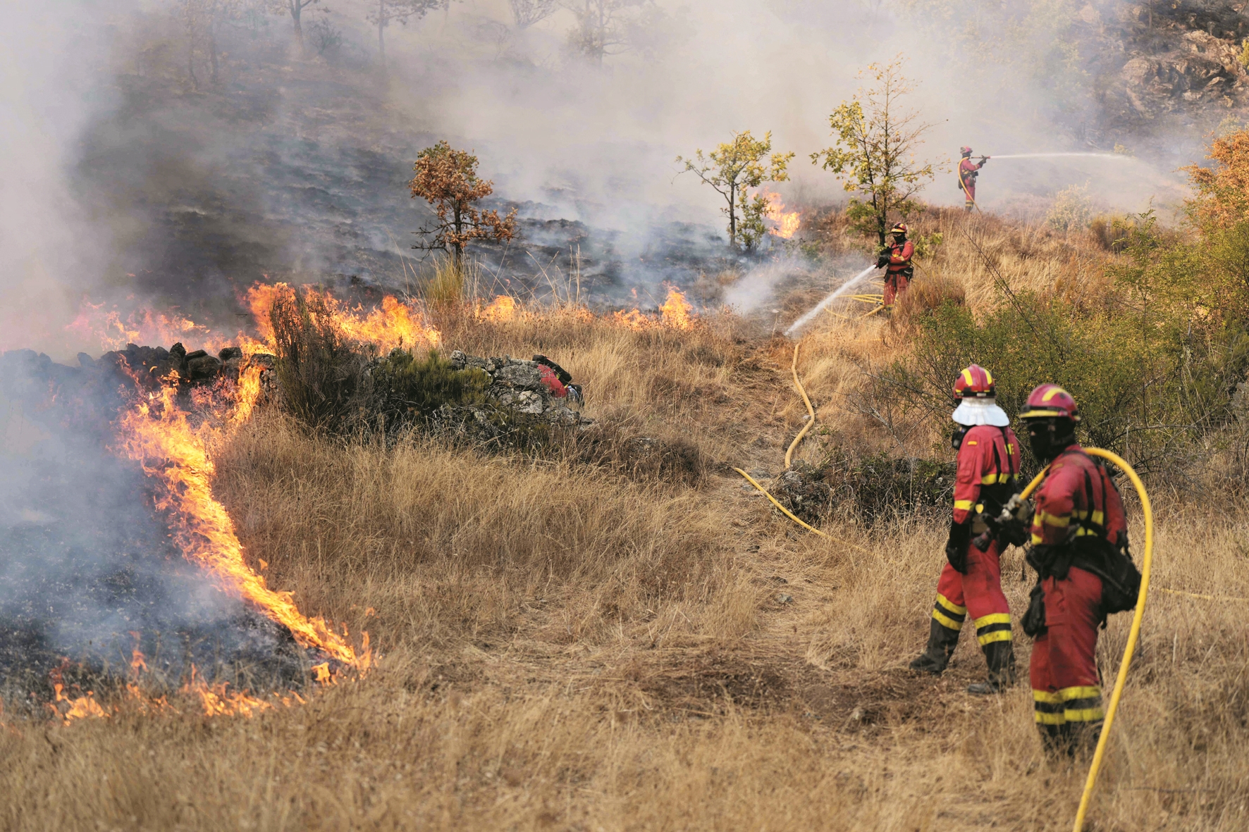 图为8月25日,在西班牙西北部莱昂附近,应急人员进行灭火作业。