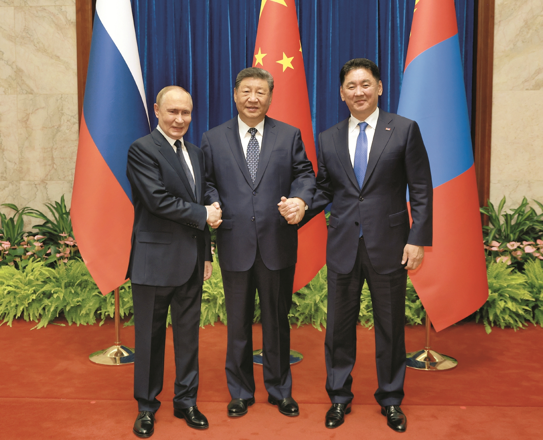9月2日上午,国家主席习近平同俄罗斯总统普京、蒙古国总统呼日勒苏赫在北京人民大会堂举行中俄蒙三国元首第七次会晤。新华社记者 丁海涛摄