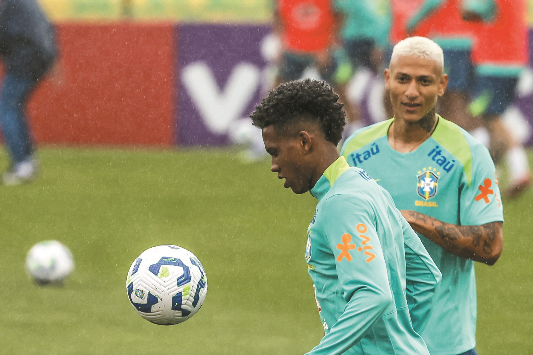9月1日,巴西国家足球队在巴西特雷索波利斯进行赛前训练,备战4日与智利队的世界杯南美区预选赛。 图为当日,巴西队球员埃斯特旺(左)和理查利松在训练中。(新华社发)