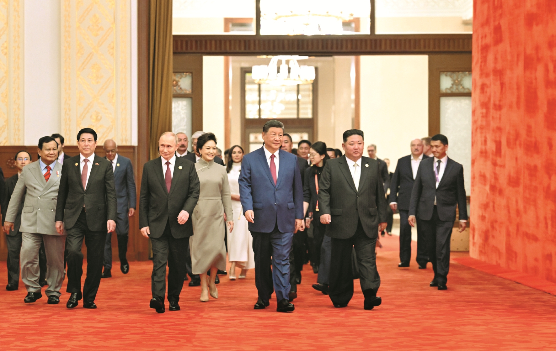 9月3日,纪念中国人民抗日战争暨世界反法西斯战争胜利80周年招待会在北京人民大会堂隆重举行。中共中央总书记、国家主席、中央军委主席习近平出席招待会并发表重要讲话。这是习近平和夫人彭丽媛同出席招待会的外国领导人夫妇共同步入宴会厅。新华社记者 谢环驰摄