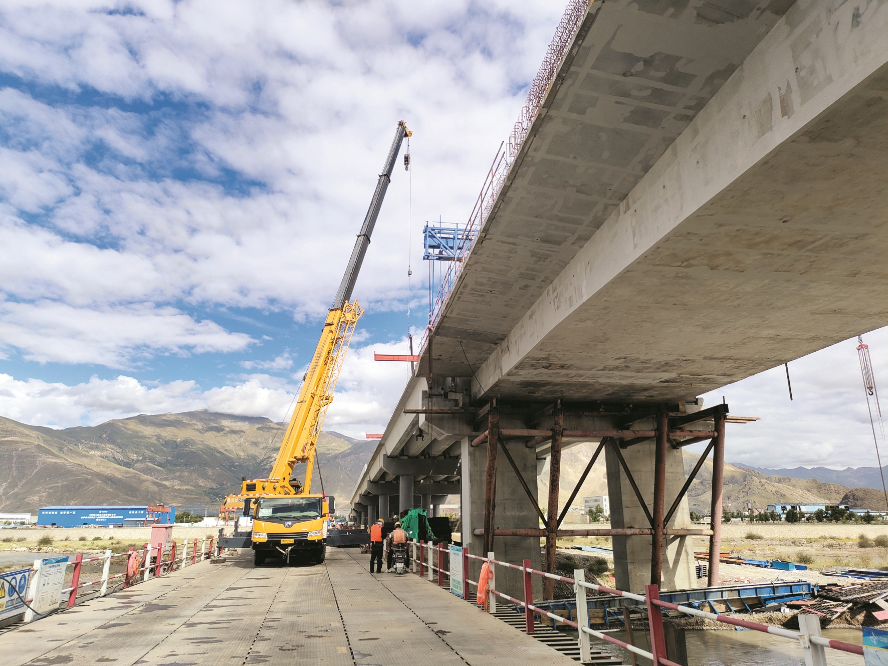 拉萨经开区聂当工业园聂当特大桥项目起于拉萨市柳梧新区机场高速达东互通连接线,横跨拉萨河后止于曲水县聂当乡聂当工业园,路线全长1.81公里,其中聂当特大桥全长1508米。9月4日,记者来到项目现场看到,主引桥均已完成合龙,工人正进行后续的桥梁结构涂装、路基填筑施工等。