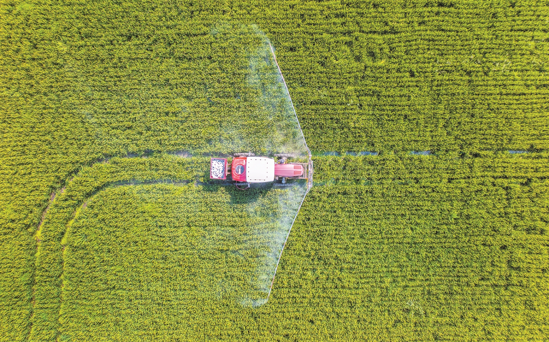 ↑图为9月6日,在江苏省海安市角斜镇范堑村,村民驾驶植保机械在水稻田里进行喷洒药物作业(无人机照片)。