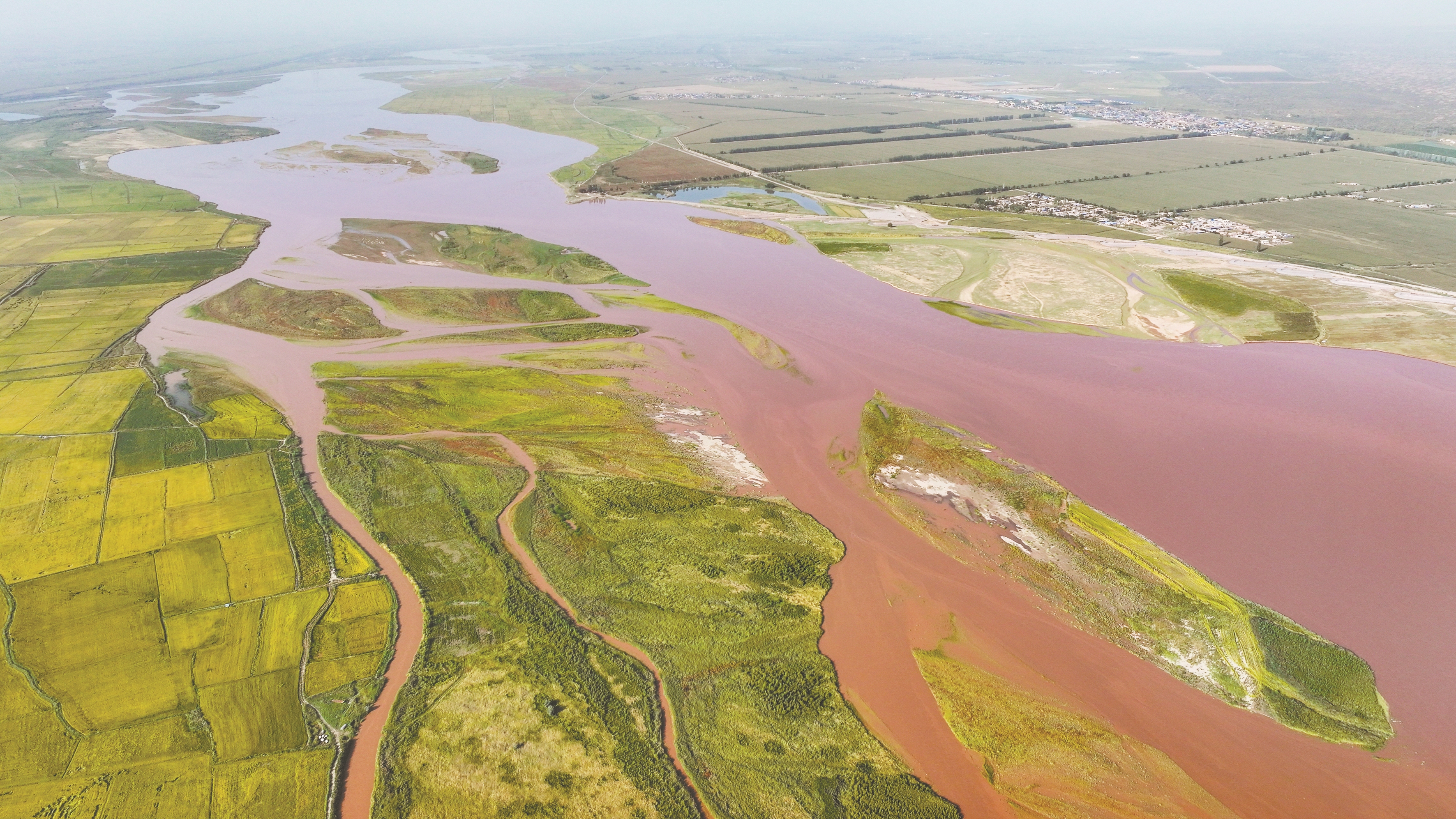 这是9月6日在宁夏石嘴山市平罗县境内拍摄的黄河滩涂湿地和稻田(无人机照片)。