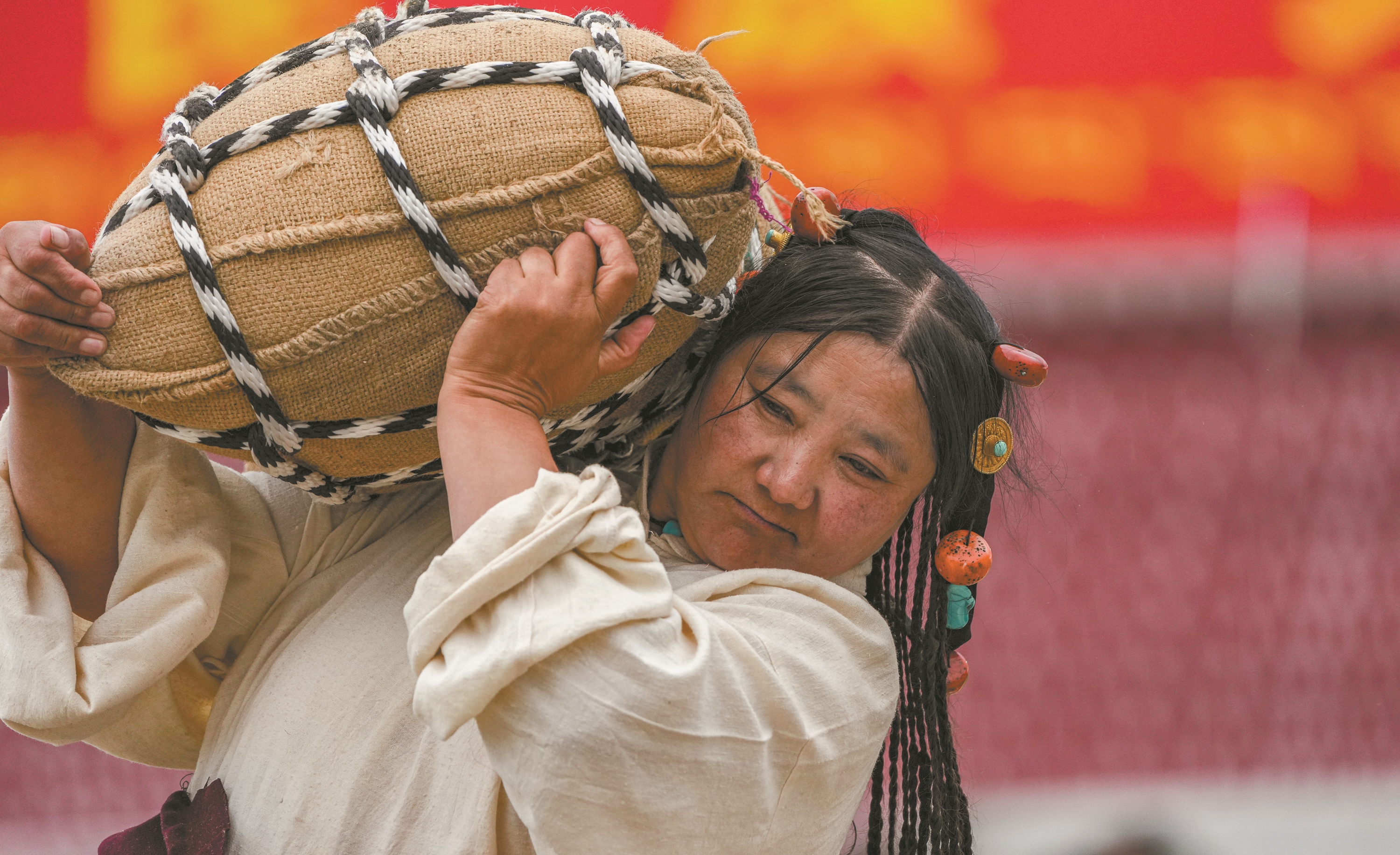 图②为一名选手在抱沙袋比赛中(9月5日摄)。