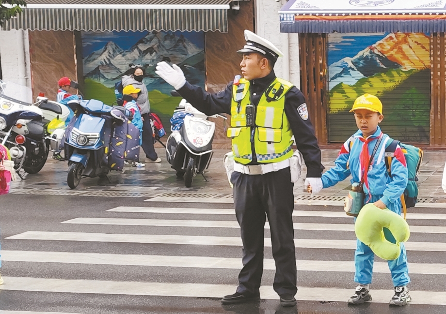 在位于朵森格路的拉萨市第一小学校门口,市公安局交通管理支队城东大队的民警们正穿梭于车流中。他们时而手势明确地拦停来往车辆,时而温柔地牵着学生们的小手,护送一批又一批孩子过马路,确保每名学生都能平安进入校园。
