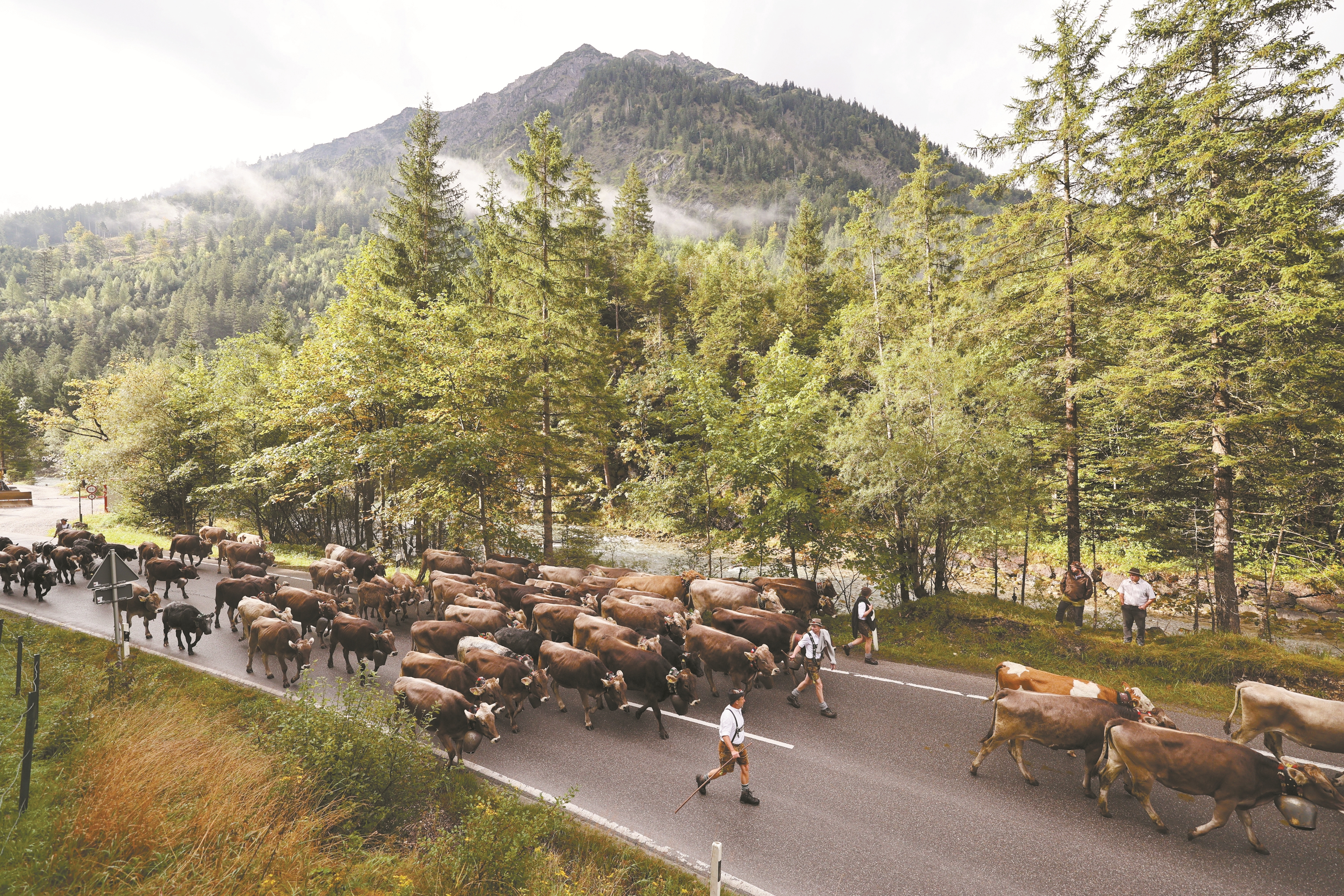 图为9月11日,在德国巴特欣德朗举行的传统“赶牛下山”活动期间,农民引领牛群返回山谷。