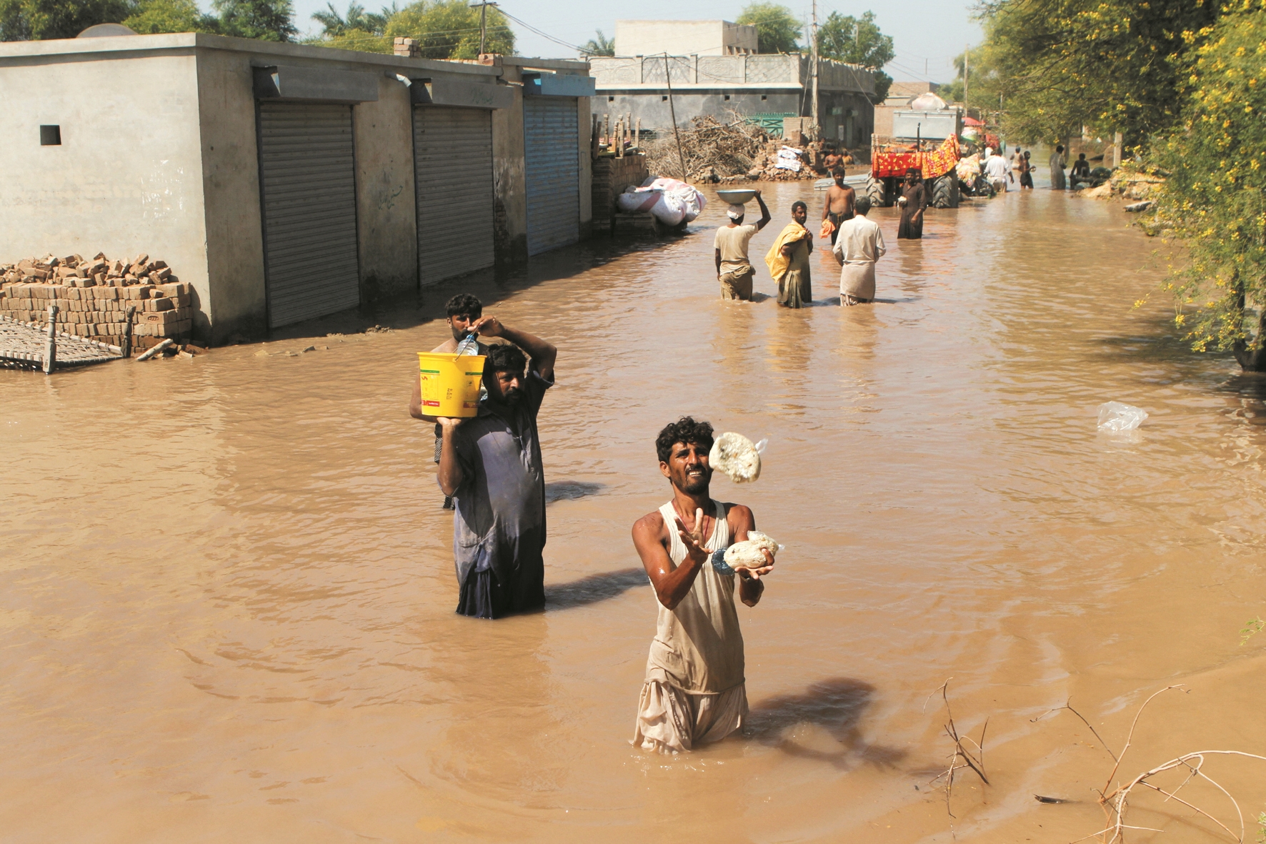 受季风气候影响,近日巴基斯坦多地遭遇强降雨天气,引发洪水侵袭。图为9月13日,在巴基斯坦旁遮普省,人们手拿食物走过被洪水淹没的街道。(新华社发)