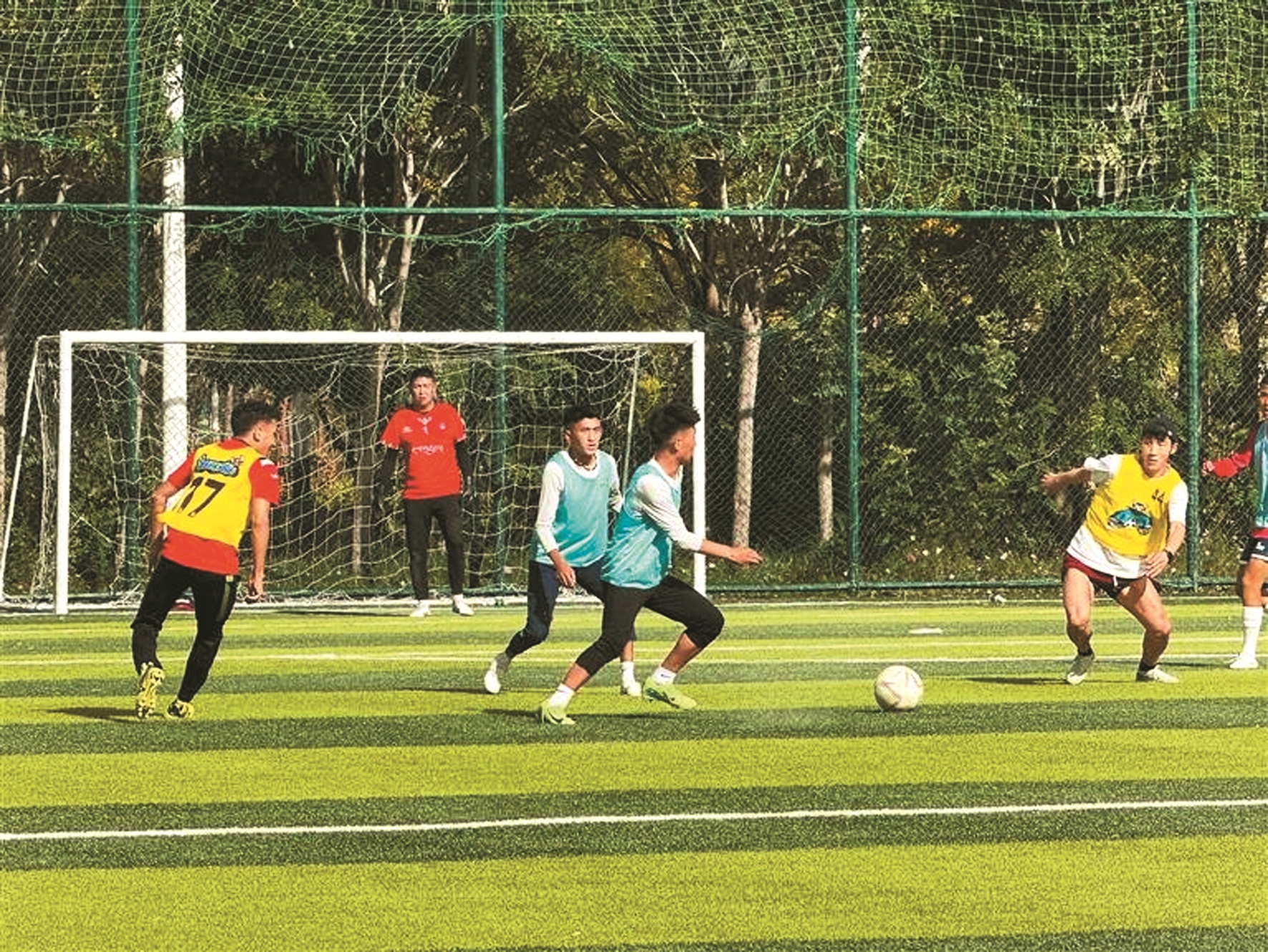 图为拉萨滨河体育公园内,足球爱好者们正在比赛。