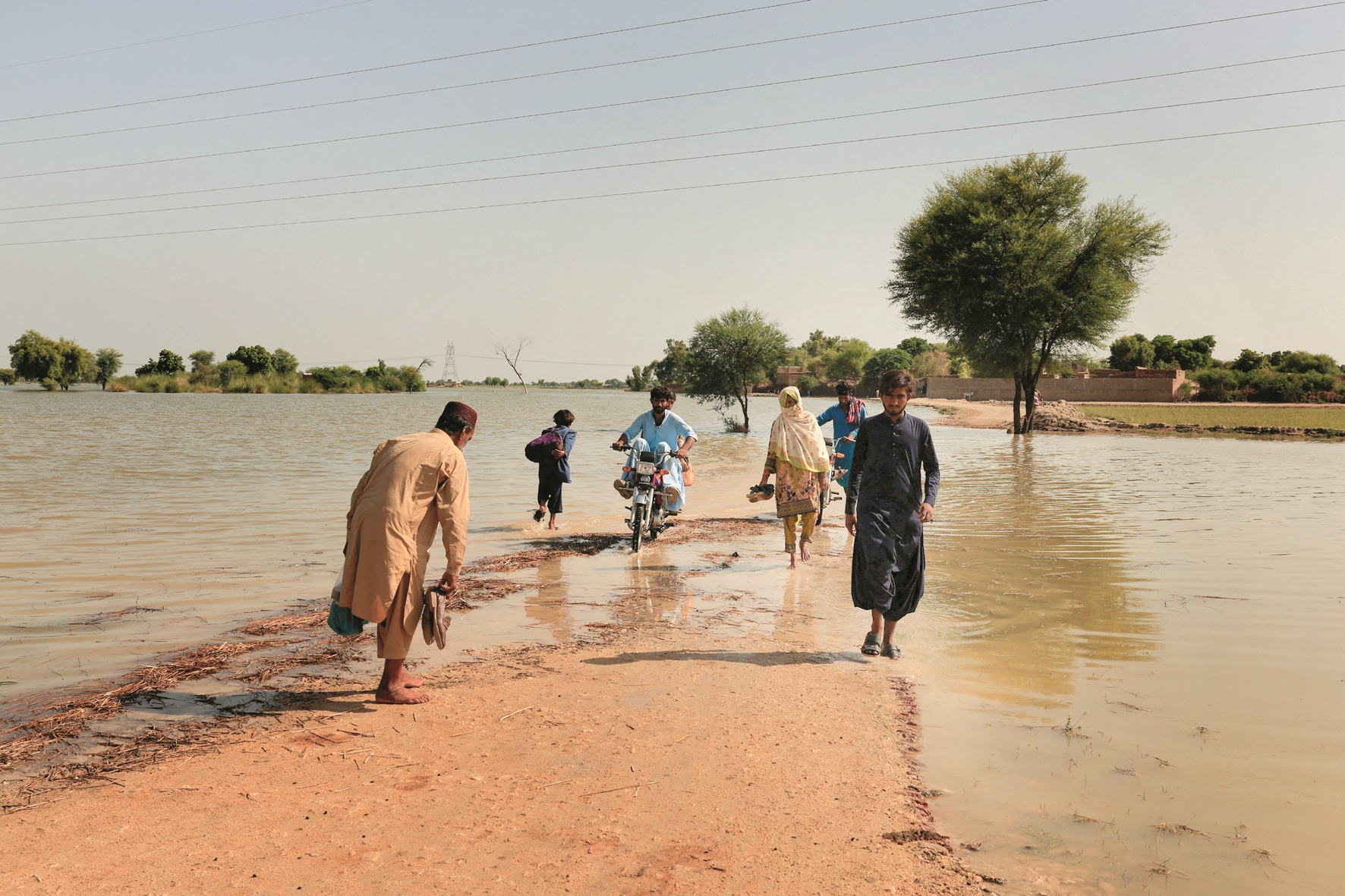 图为9月15日,在巴基斯坦达杜,人们在积水的道路上出行。