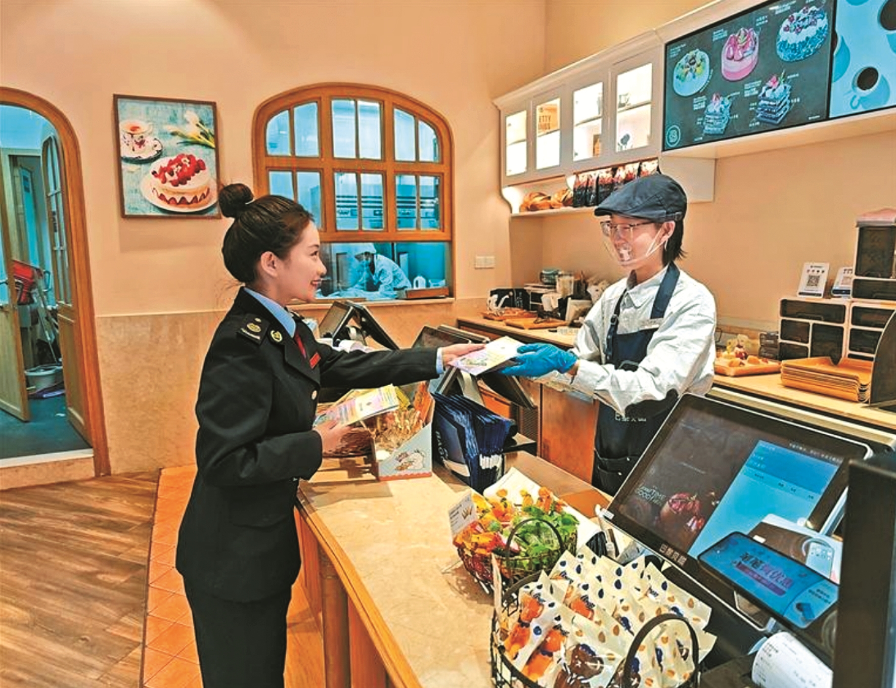 图为拉萨市税务干部为餐饮门店上门宣讲增值税优惠政策。