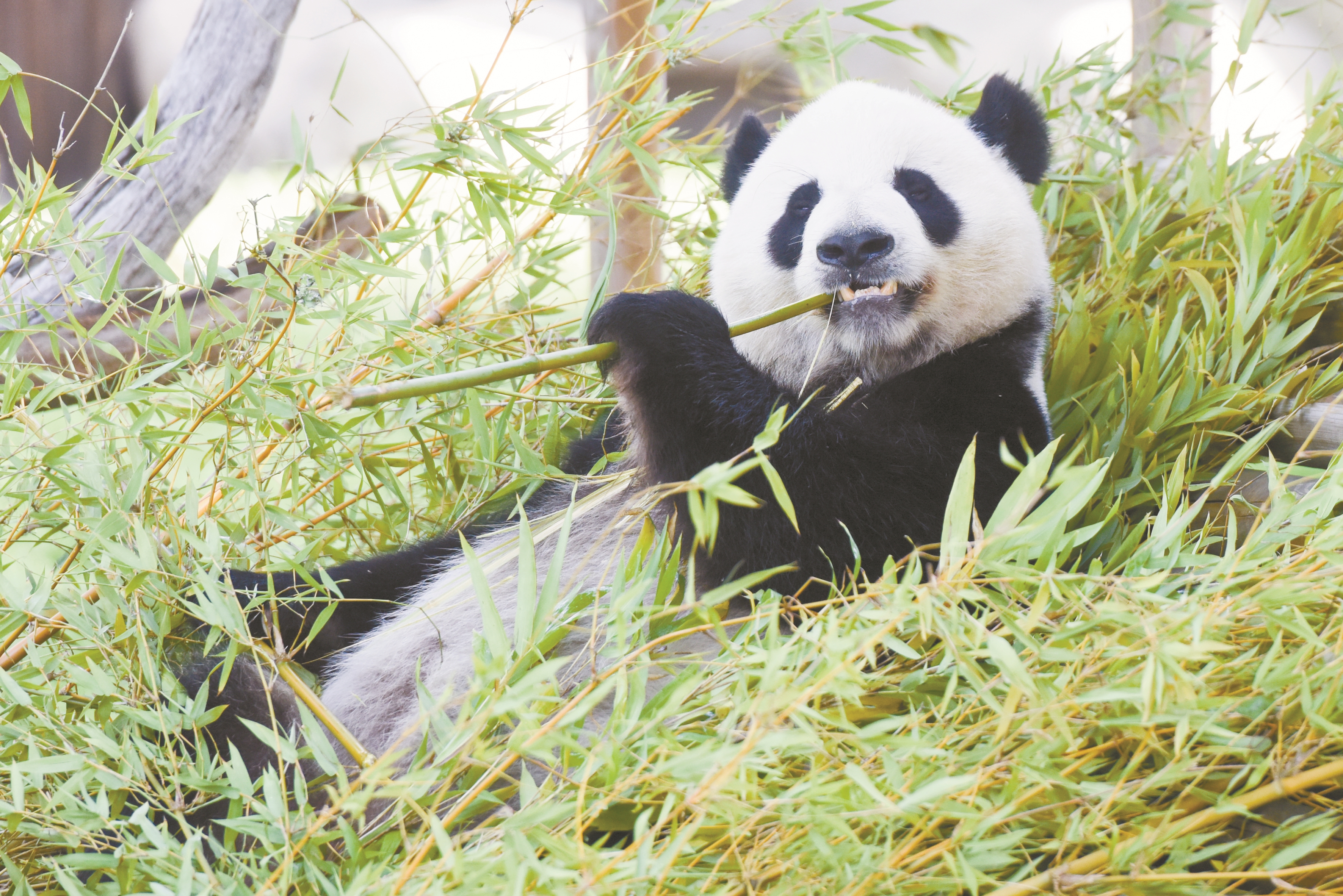 图为9月20日,在西班牙马德里动物园,大熊猫“金喜”在吃竹子。 (新华社发)