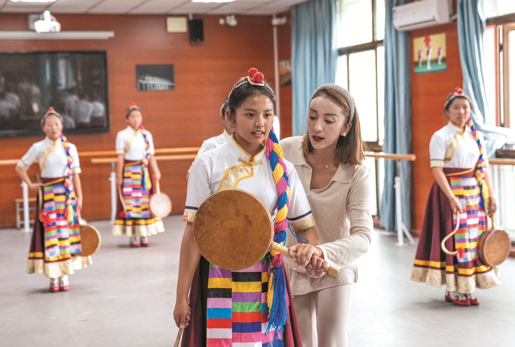 这是9月9日,在拉萨市第二中等职业技术学校,尼玛卓玛老师(右二)指导孩子们舞蹈动作。