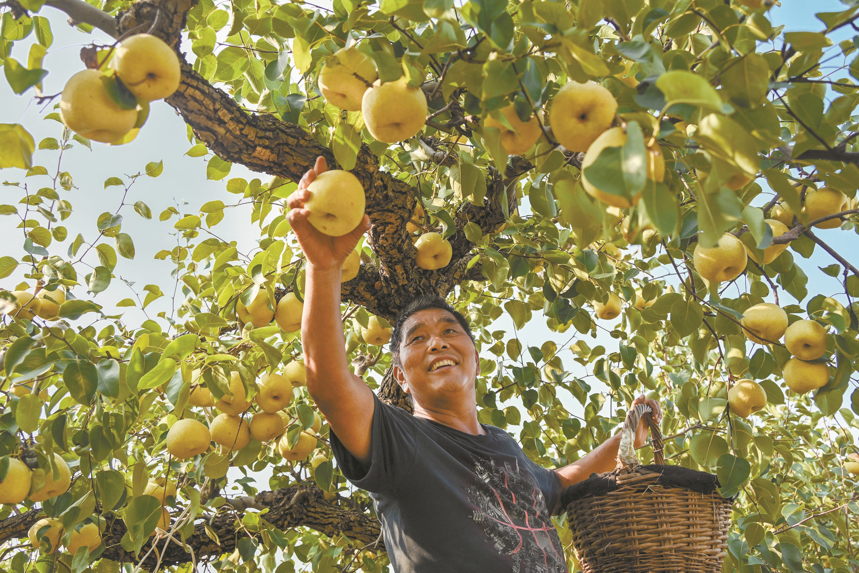 图为9月15日,在安徽省宿州市砀山县一处梨园内,梨农在采摘酥梨。(新华社发)